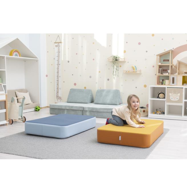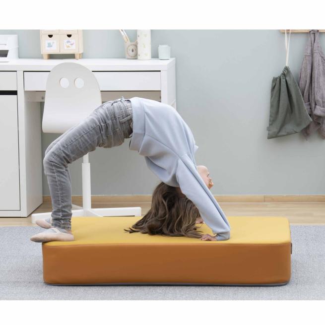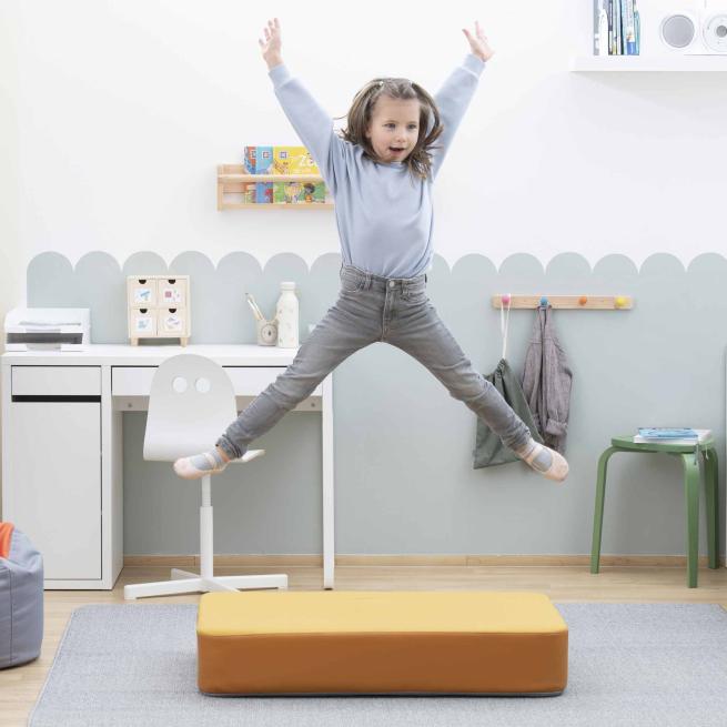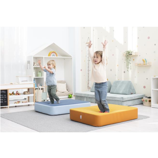 Multifunktionales Hüpfpolster, das alles bietet, was man will: Es ist angenehm weich, besitzt eine den kindlichen Bewegungsapparat schonende Federung (Stahlfederkern) und ist mit einem bequemen Textil- und Kunstlederbezug versehen. Die Kinder nutzen das Polster zum ausgiebigen und altersgerechten Springen oder zum entspannten Ausruhen. Die rutschfeste Unterseite aus Turnmattenstoff sorgt dabei stets für sichere Bodenhaftung. Dank kompakter Maße von 97 x 70 x 17 cm (L x B x H) findet das Hüpfpolster nahezu überall seinen Platz.