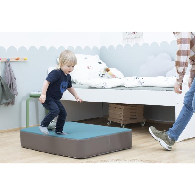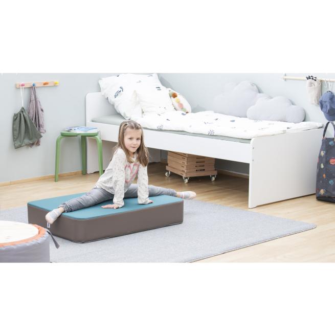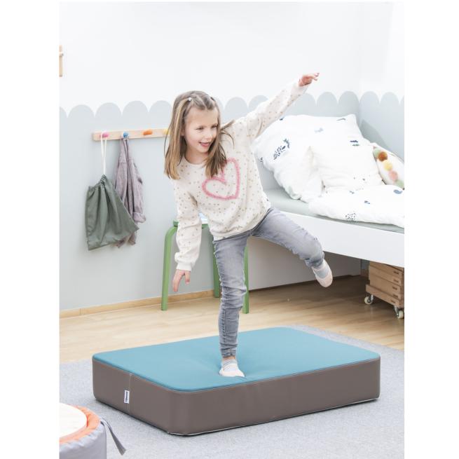 Multifunktionales Hüpfpolster, das alles bietet, was man will: Es ist angenehm weich, besitzt eine den kindlichen Bewegungsapparat schonende Federung (Stahlfederkern) und ist mit einem bequemen Textil- und Kunstlederbezug versehen. Die Kinder nutzen das Polster zum ausgiebigen und altersgerechten Springen oder zum entspannten Ausruhen. Die rutschfeste Unterseite aus Turnmattenstoff sorgt dabei stets für sichere Bodenhaftung. Dank kompakter Maße von 97 x 70 x 17 cm (L x B x H) findet das Hüpfpolster nahezu überall seinen Platz.