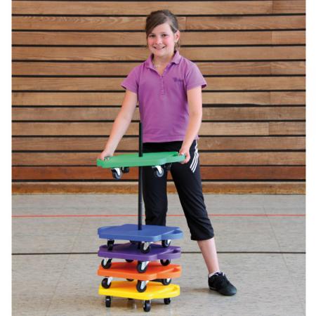 Diese Modelle aus bruchsicherem Kunststoff haben leicht laufende Gummi-Rollen. So sind sie sehr leise und schonen den Hallenboden.