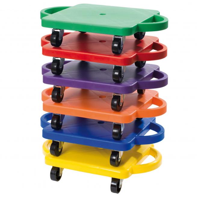 Diese Modelle aus bruchsicherem Kunststoff haben leicht laufende Gummi-Rollen. So sind sie sehr leise und schonen den Hallenboden.