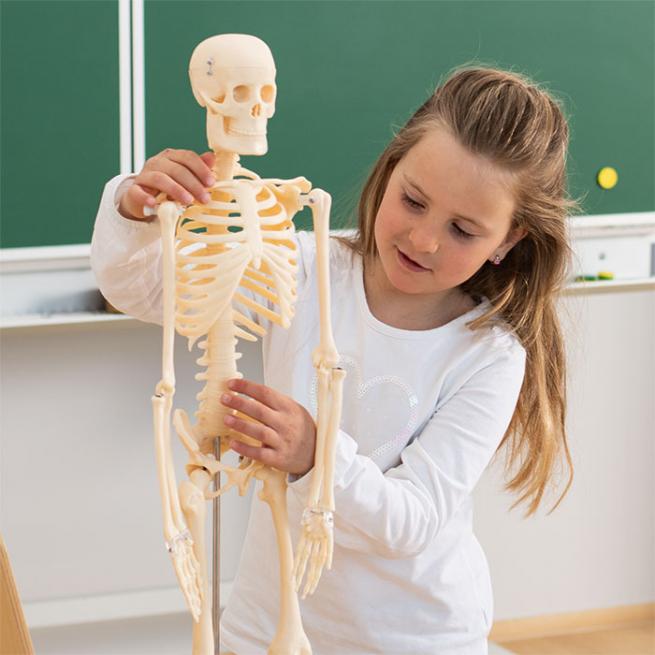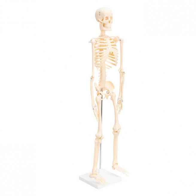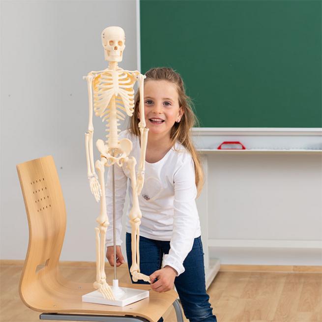 21 naturgetreue Teile aus bruchfestem Kunststoff. Schädel und Gliedmaßen sind beweglich montiert. Das Skelett können Sie vom Stativ herunternehmen. Ca. 80 cm groß.