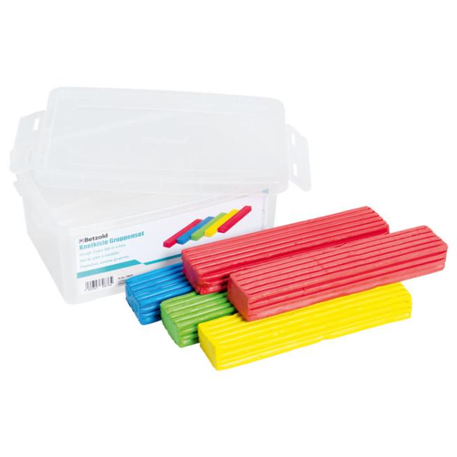 2.500 g Knetmasse: 1.000 g in Rot, je 500 g in Blau, Gelb, Grün. Die transparente Aufbewahrungskiste hat einen Deckel.