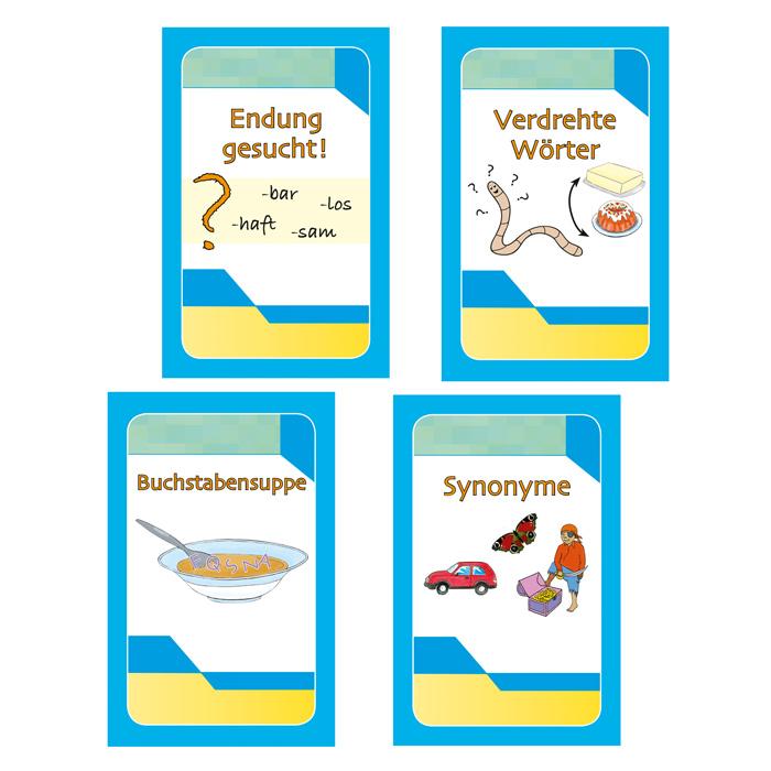 Bestehend aus Buchstabensuppe, Endung gesucht, verdrehte Wörter, Synonyme und dem magischen Zylinder.