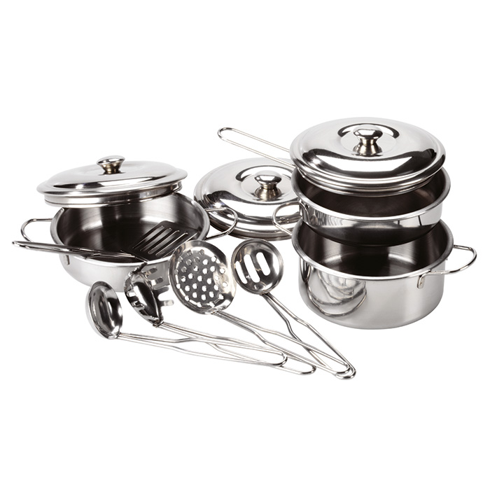 3 Töpfe (Ø 9 cm, H = 2,5 bis 4 cm) mit Deckel und 5 Handgeräten im Edelstahl-Look.