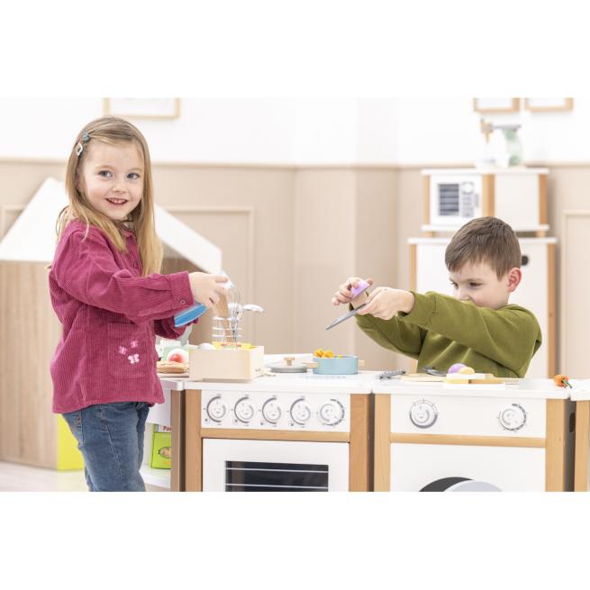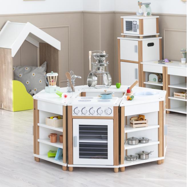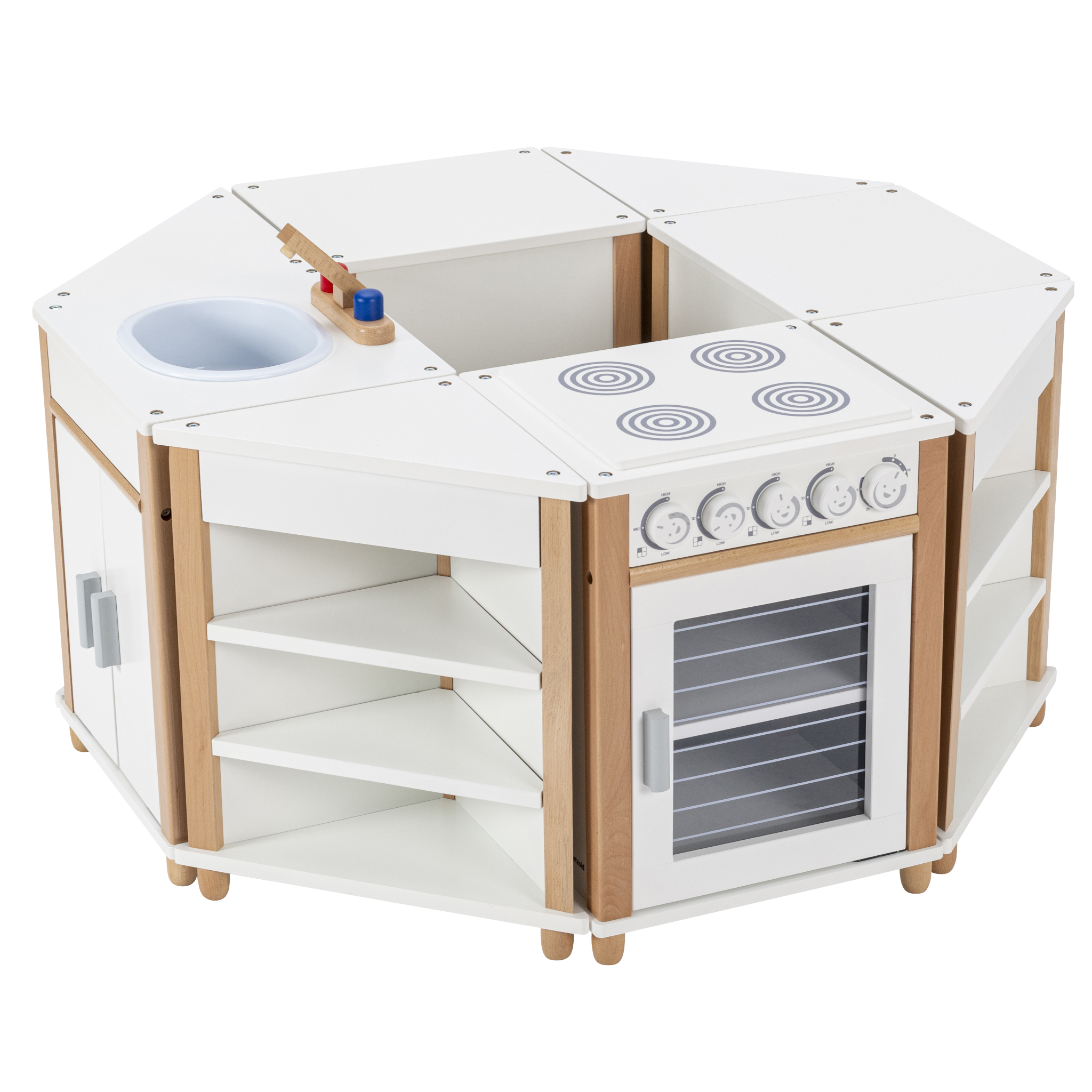 Eine runde Sache – die Kochinsel für kleine Küchenprofis. Sie ist rundherum bespielbar, aber auch flexibel anders aufstellbar. Das 8-teilige Set bringt alles mit, was Kinder für kreative Rollenspiele brauchen: Herd mit Backofen, Spülbecken, Spülmaschine, Waschmaschine und 4 robuste Küchenregale. Hier kochen, backen und spülen die kleinen Köchinnen und Köche nach dem Vorbild der Großen. Dabei schulen sie spielerisch ihre Feinmotorik, soziale Fähigkeiten und die Freude am gemeinsamen Spiel.