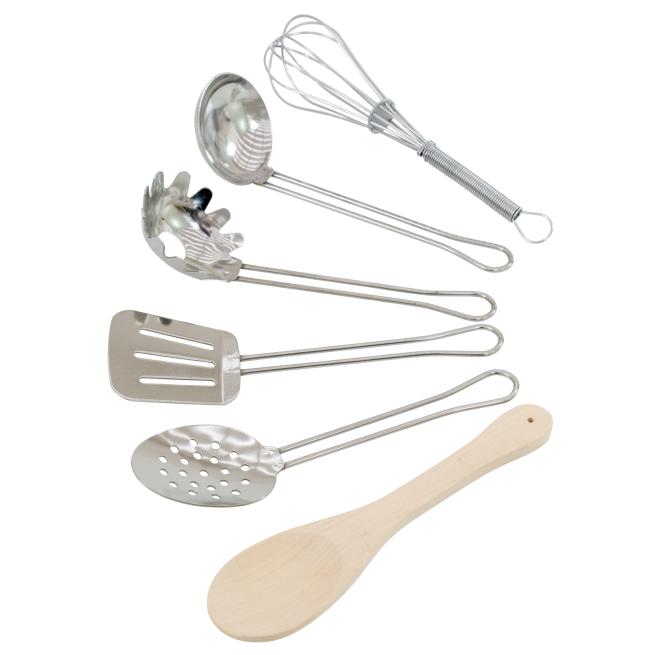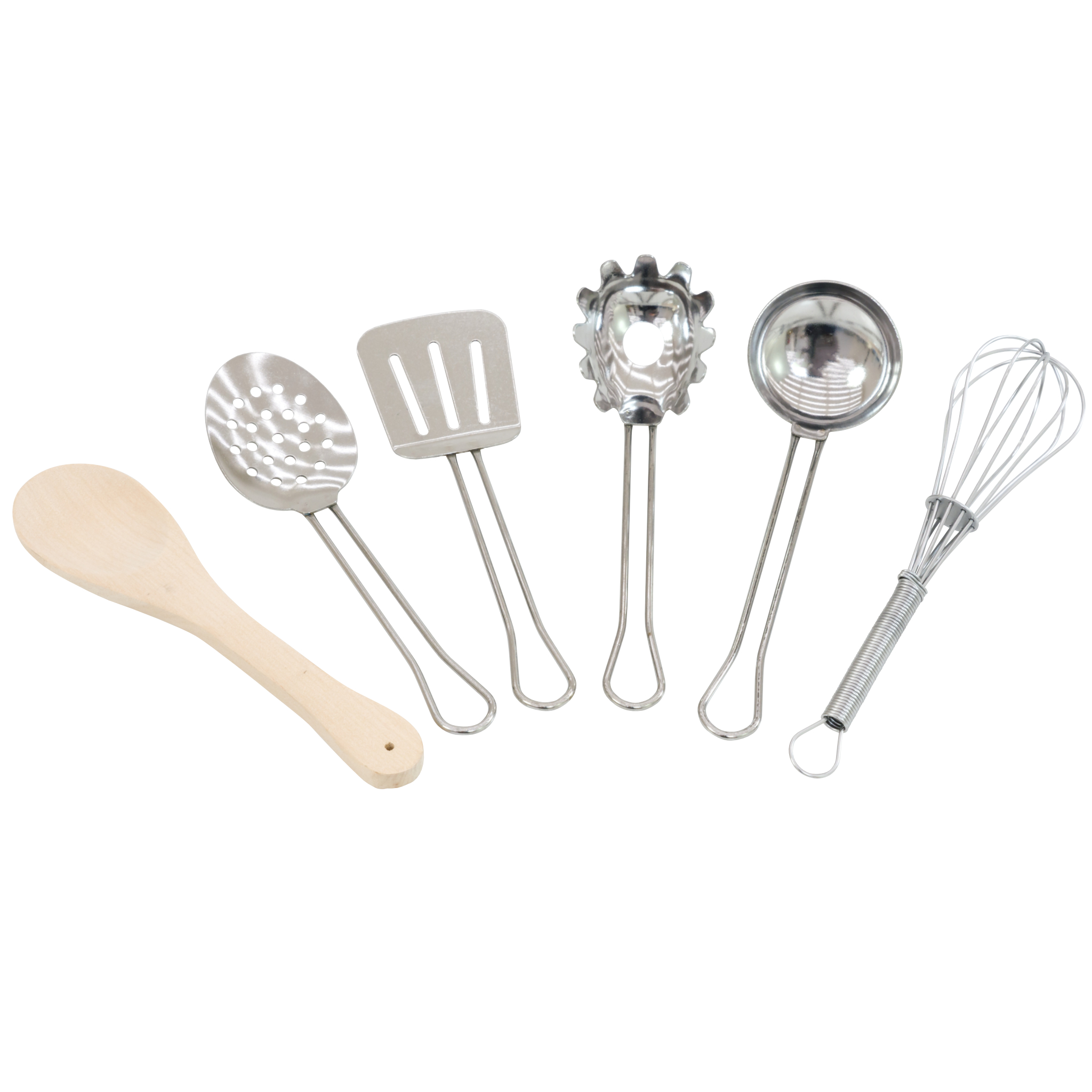 Das 7-teilige Kochgeräte-Set ist perfekt für die Kinderküche und enthält alles, was kleine Köche brauchen u.a. Kochlöffel, Pfannenwender und Schneebesen.