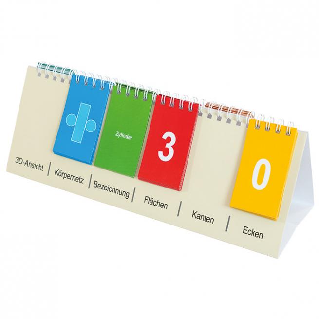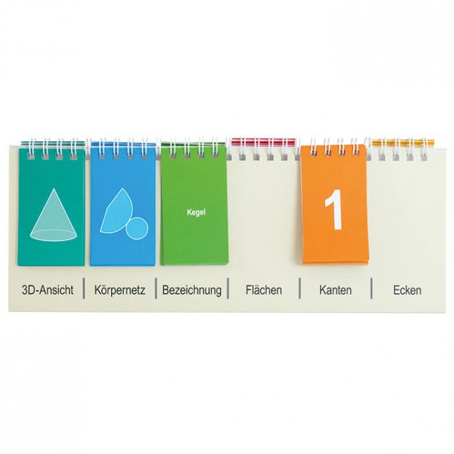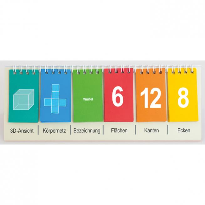 Wie sieht ein Würfel in der 3D-Ansicht aus, wie sieht sein Körpernetz aus, wie viele Flächen, Kanten und Ecken hat er? Solche Fragen beantwortet der hilfreiche Körper-Flip nicht nur in Bezug auf den Würfel, sondern noch für 11 weitere geometrische Körper. Jede der jeweils 6 Kategoriekärtchen ist dank Ringbuchbindung einfach umzuflippen. Fürs selbstständige Lernen ist zur Selbstkontrolle auf der Rückseite der 3D-Ansichten die jeweilige Lösung abgebildet.