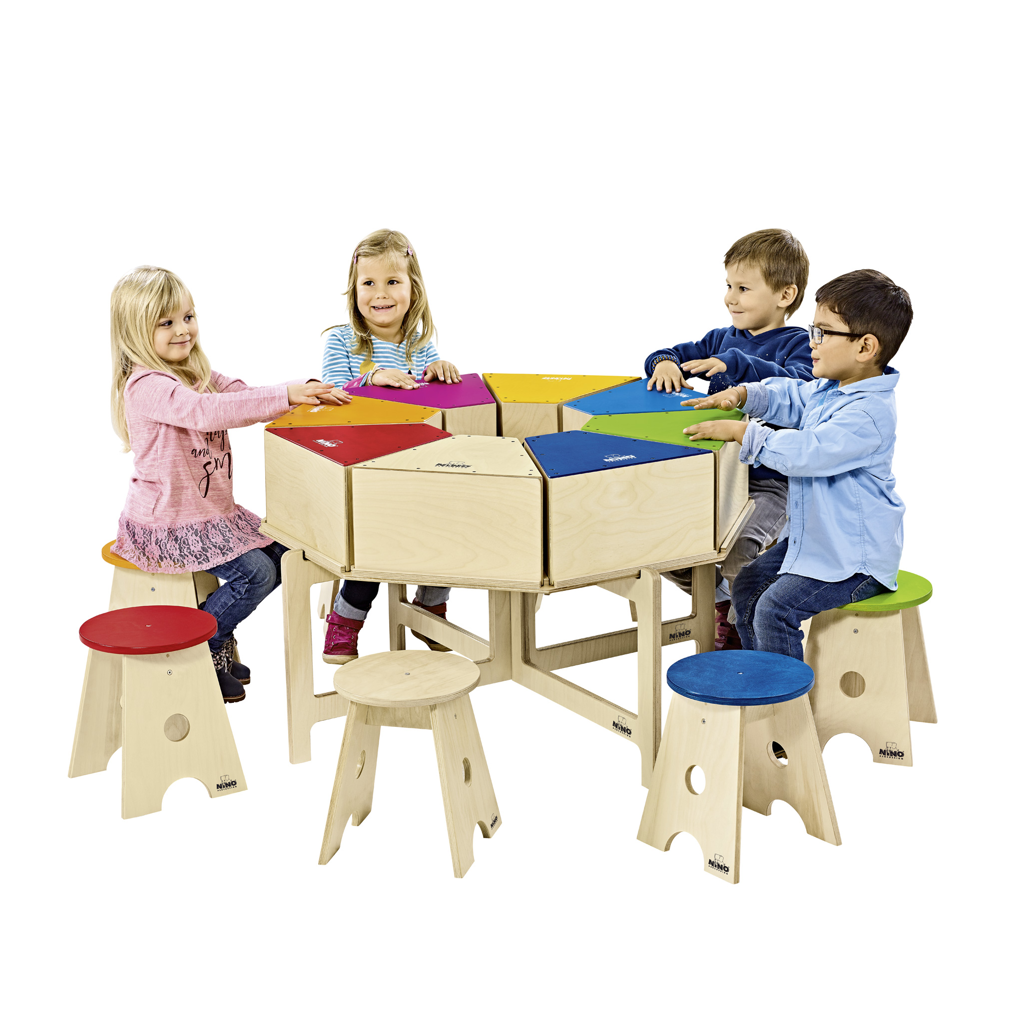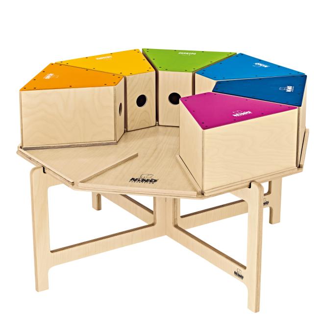 Gestalten Sie eine komplette Rhythmus-Station für gemeinsames Trommelteamwork in großer Runde. Enthalten in diesem großen Set sind 8 Cajones mit Oberseiten in 8 unterschiedlichen Farben, eine Basisholzplatte, ein stabiler Holzständer und 8 farblich abgestimmte Hocker.