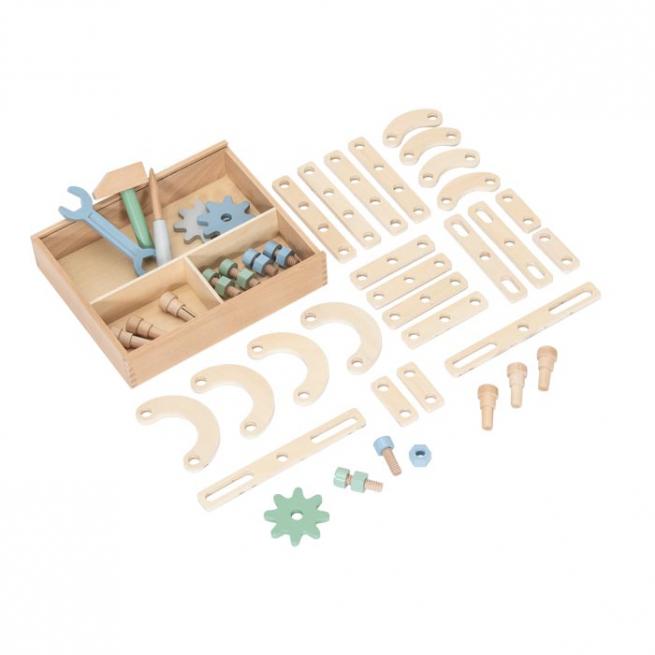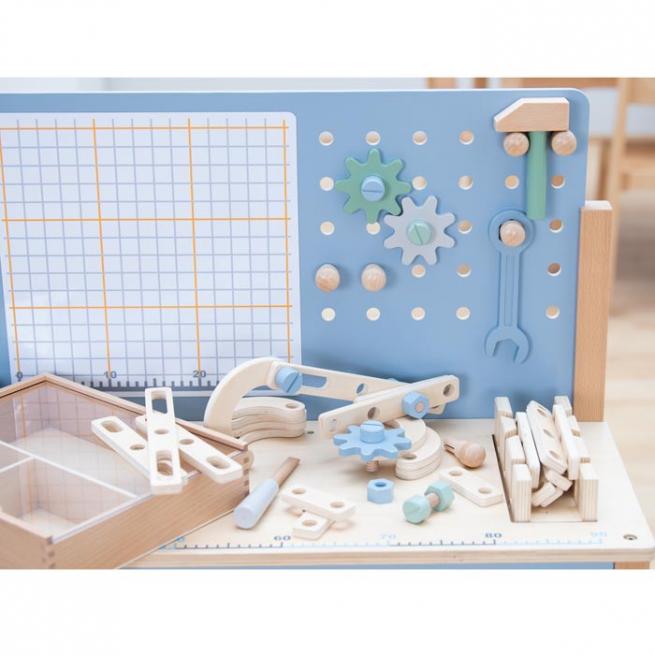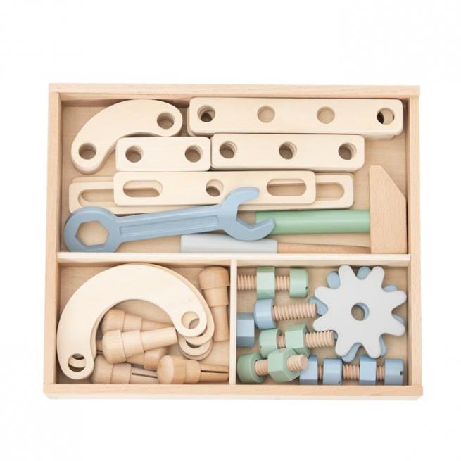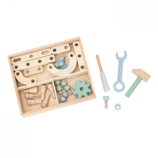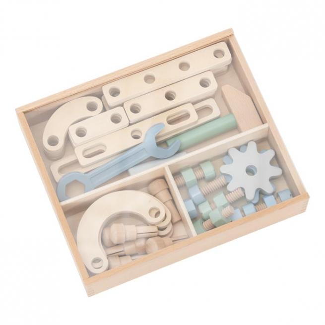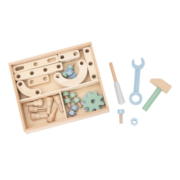 Schrauben, Muttern, Steckdübel und mehr sind Handwerkszeug für kleine Tüftler. Die Holzbox mit Schiebedeckel bietet kleinen Handwerkern besten Überblick über all ihre »Eisenwaren«. Die Kinder werkeln mit dem Set aus Holz auch optimal an der Spiel-Werkbank.