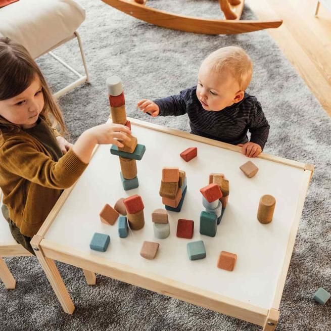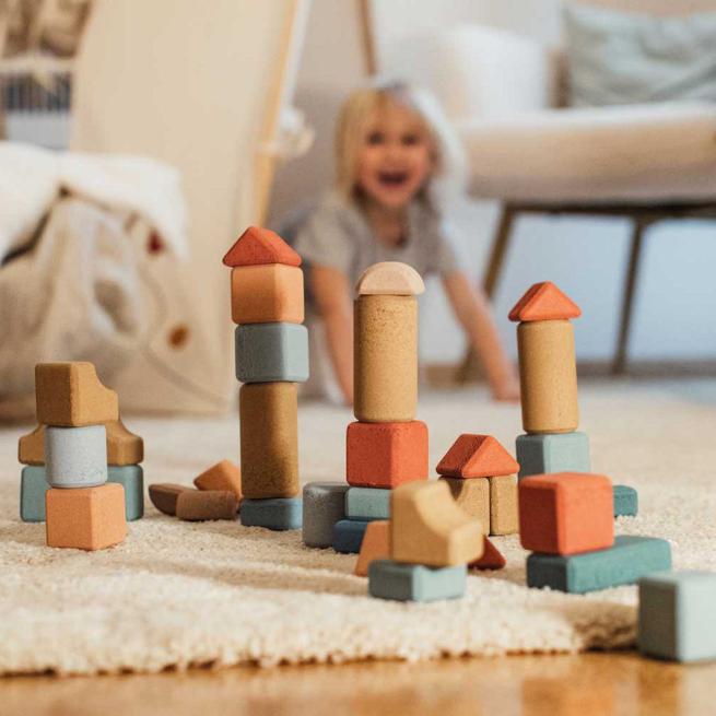 Bauklötze aus Kork sind etwas Besonderes. Mit der Produktlinie Kork’s entdecken Kinder spielerisch und intuitiv natürliche bunte Steine und Formen. Die Bausteine haben einen hohen Spielwert und überzeugen durch ihr leichtes, warmes und angenehmes Material, das gut in Kinderhänden liegt. Außerdem sind sie besonders leise. Dank der leicht rauen Oberfläche stapeln Kinder kreative Kunstwerke ganz einfach. Ein tolles, haptisches Training.