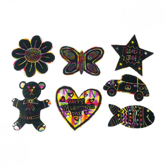 Die 7 Auto-, Blumen-, Bären-, Fische-, Herzen-, Schmetterlinge- und Sterne-Kratzbilder bearbeiten Ihre Kinder mit einem Kratzstift (nicht enthalten) und legen dabei leuchtende Regenbogenfarben frei. Eine gute Beschäftigung für zwischendurch.