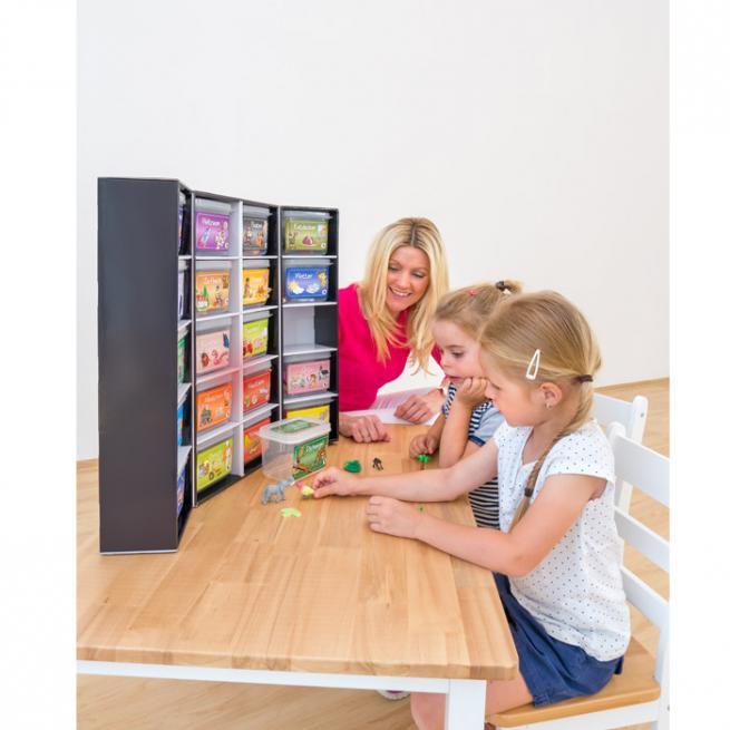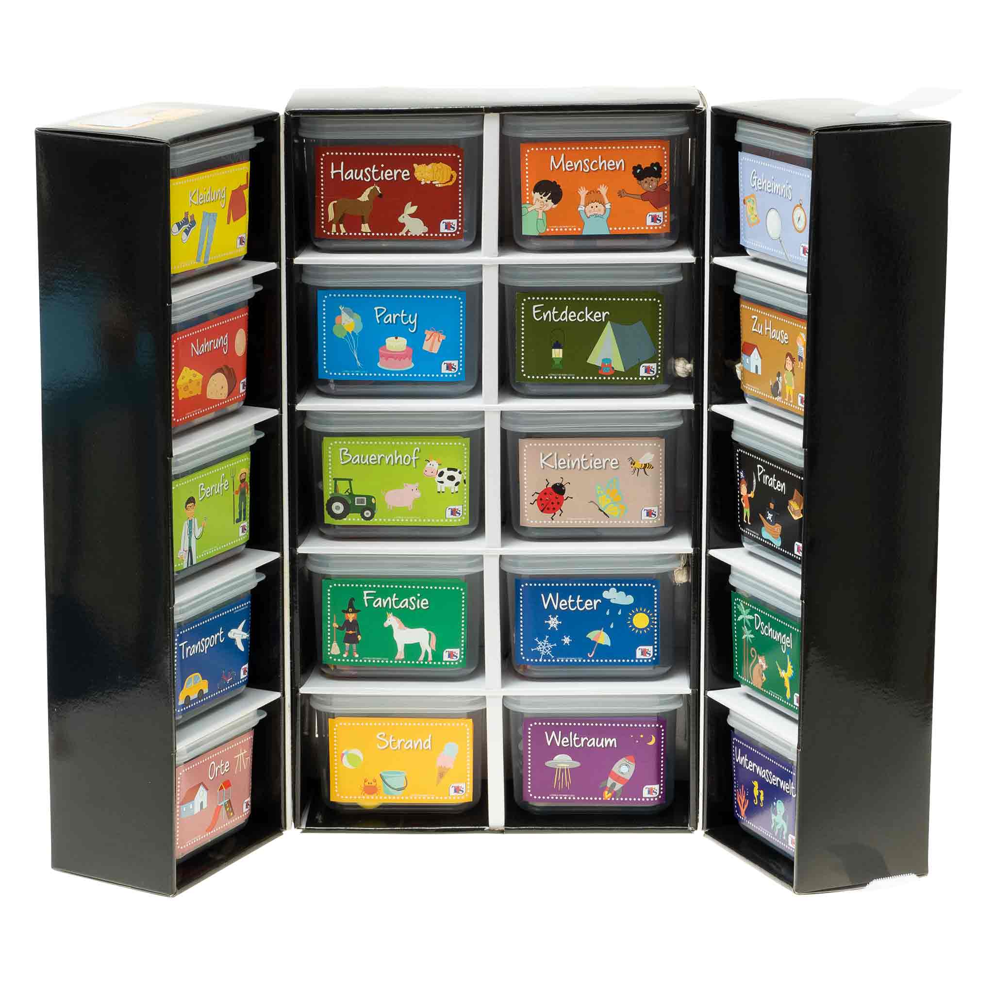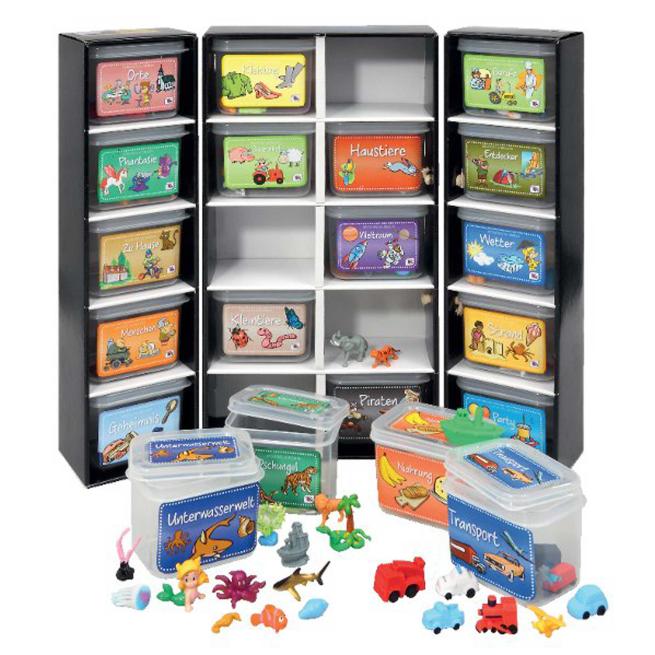 Die 20 Boxen mit über 200 Miniatur-Figuren bieten verschiedenste Sprechanreize, die auch sprachschwachen Kindern eine kreative Ebene bieten. Erlauben Sie Ihren Kindern die Boxen zu erforschen. Wie von selbst entstehen damit die schönsten Geschichten. Ob Geschichten erfinden, nachspielen und die Handlung sprachlich begleiten – der Einsatz von Figuren erleichtert dabei das Erzählen und Zuhören.