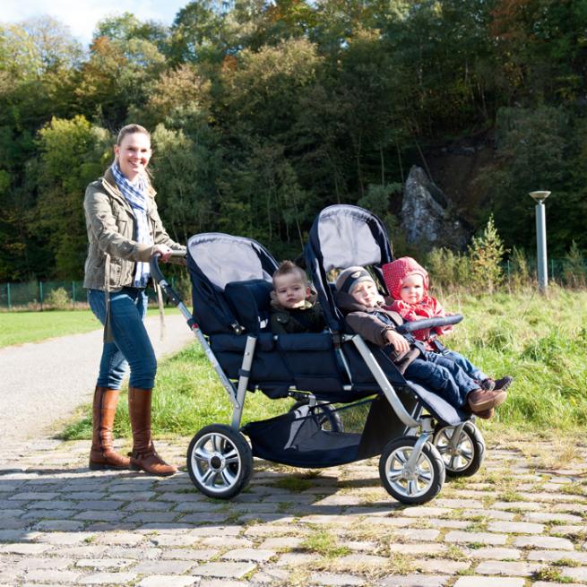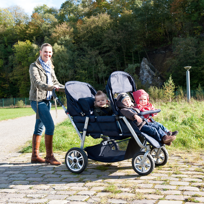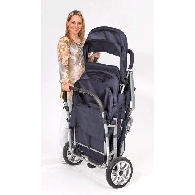 4 Ihrer Schützlinge nehmen hier Platz. Die Sitzfläche für 2 Kinder ist ca. 61 cm breit. Jede Sitzreihe hat einen separaten Sonnenschutz, den Sie stufenlos einstellen können. Der Krippenwagen lässt sich zusammenklappen und gut im Kofferraum für den Transport verstauen.
