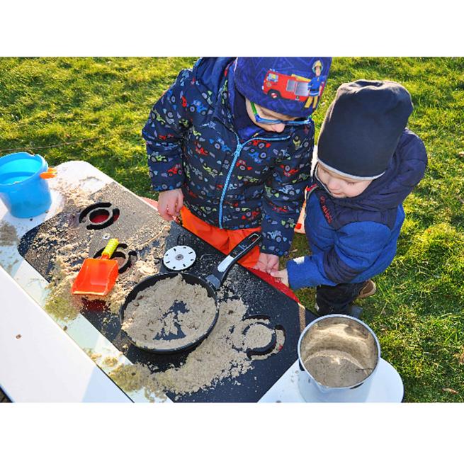 Mit dem Küchentrio-Set „Herd“ erleben die Kids die gute, alte Sandkastenküche in der Extended Version. Die Kinder laufen zur Höchstform auf und bringen das gesamte Spektrum ihrer Spielzeugförmchen, -pfannen, -schüsseln und -behälter zum Einsatz. Dabei erschaffen sie die buntesten Kreationen und großartigsten neuen Gerichte aus allem, was ihnen in die Hände fällt. Lassen Sie die Kids die Natur Ihres Außenbereichs erkunden und die Welt der Naturmaterialien kennenlernen. Munteres Experimentieren ist ausdrücklich erlaubt!