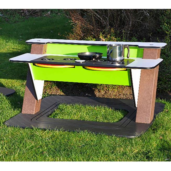 Boden- bzw. Erdankerplatte, Stützpfeiler und Kochfeld samt Herdplatten sind aus recyceltem Kunststoff hergestellt. Er stammt aus dem Rohstoffkreislauf der Wertstofftonne, ist hochwertig wiederaufbereitet und garantiert für eine ausgezeichnete Robustheit und Stabilität der aus ihm gefertigten Bauteile. Sie erhalten ein sicheres, langlebiges und witterungsbeständiges Produkt, das zugleich Ressourcen und Umwelt schont.