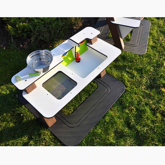Wasser ist für jedes Kind ein faszinierendes Element und am besten ist es, wenn nach Lust und Laune gematscht, geplantscht und mit dem kühlen Nass experimentiert werden darf. Wo geht das besser als draußen? Die Spüle aus der Küchentrio-Serie ist robust und aus witterungsbeständigen Materialien konstruiert. Sie ist bestens für den Einsatz im Außenbereich geeignet. Die kleinen Küchenprofis toben sich hier richtig aus. Ab 1 Jahr.