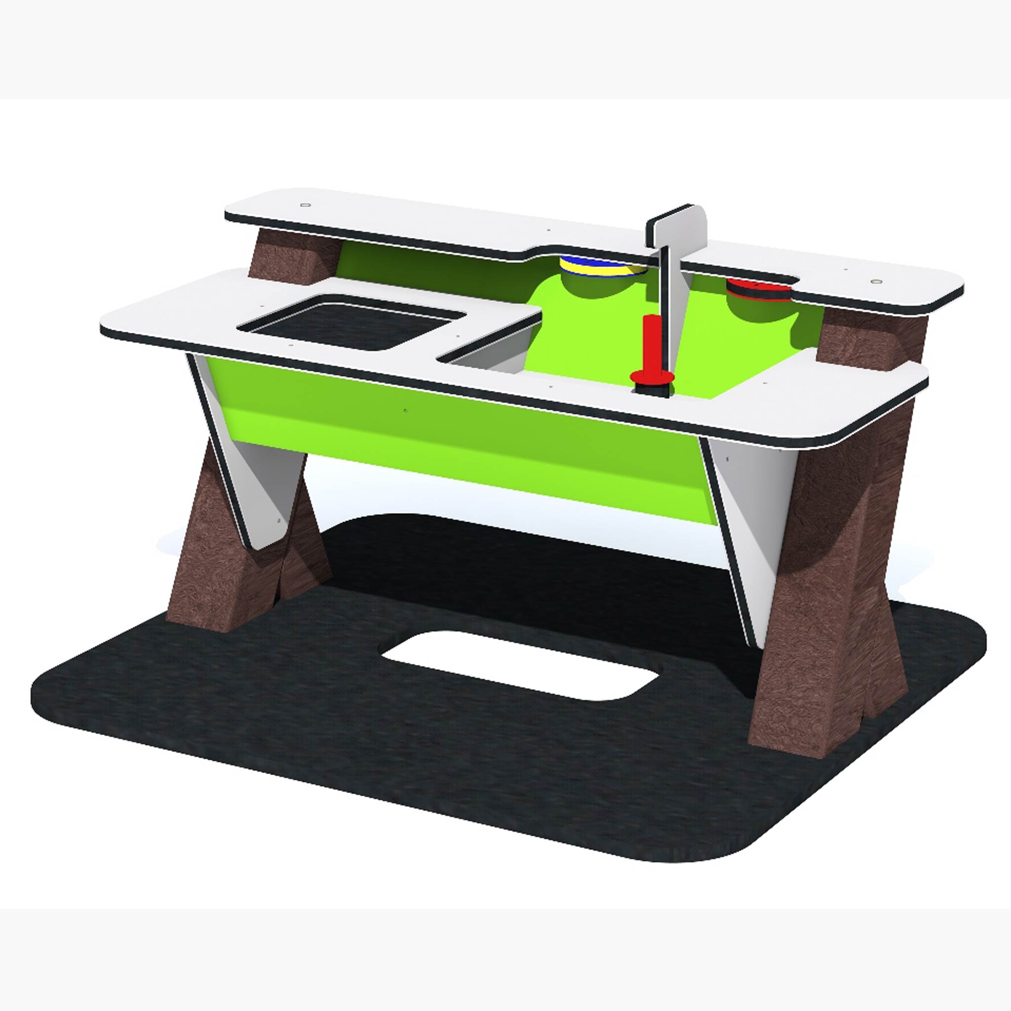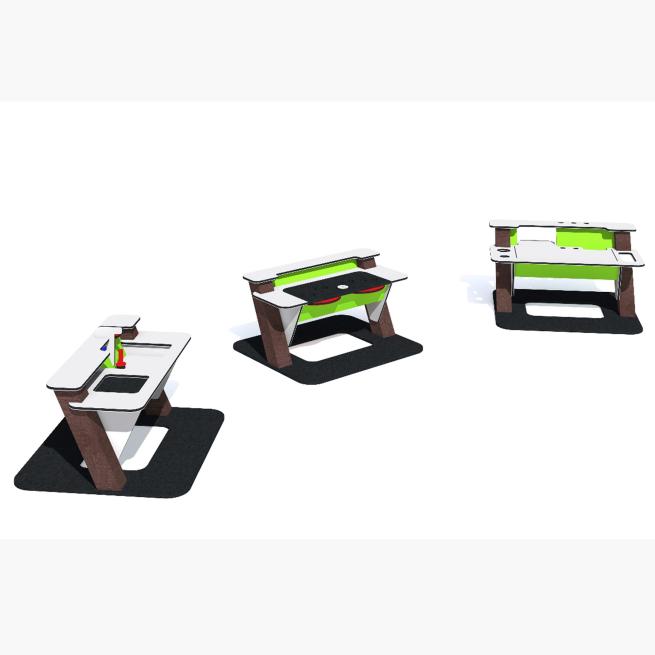 Material: Dreischichtplatte, Recycling-Kunststoff, Edelstahl, Gummi