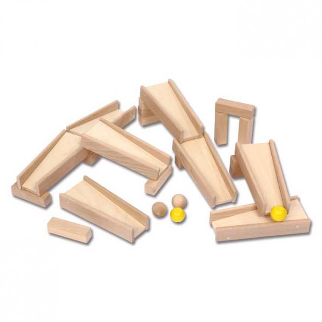 - Außenwände: Buche<br/>Schiene: Birke Multiplex<br/>Kugeln: Buche