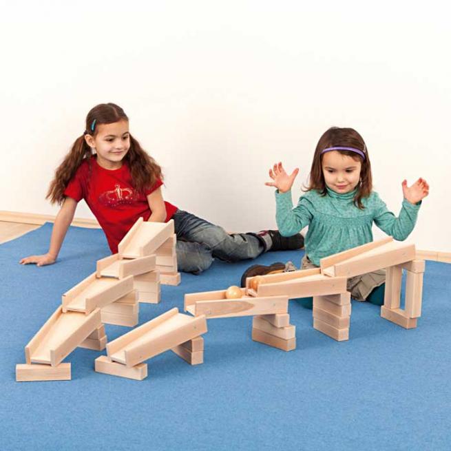 Schnell aufgebaut und immer wieder anders – da kommt die Fantasie ins Rollen. Ohne Kleinteile, dafür mit hohen Seitenrändern ausgestattet, macht das Spiel bereits kleinen Kindern Spaß.