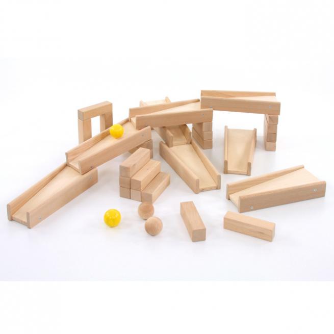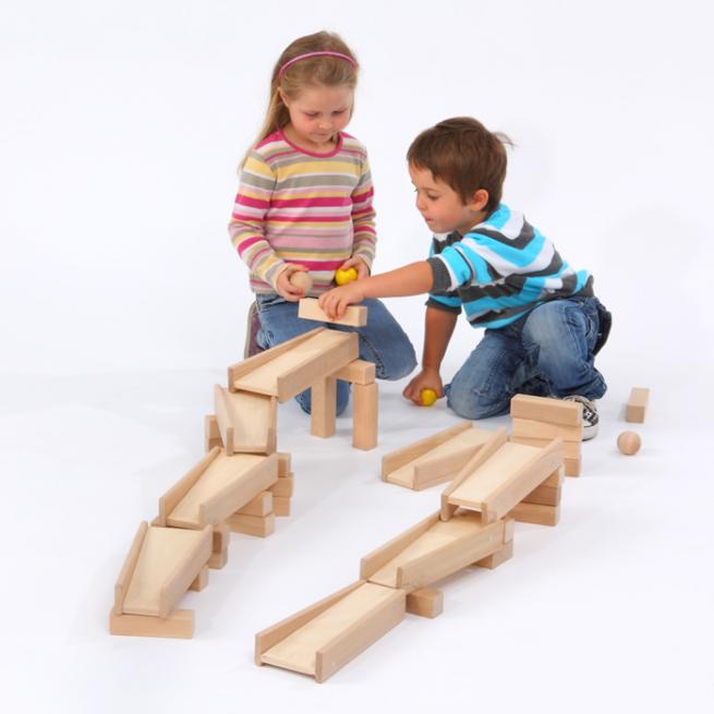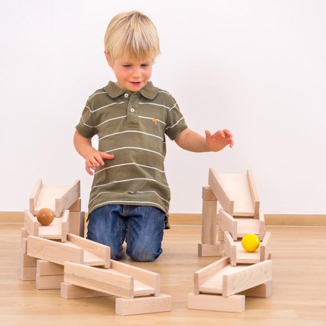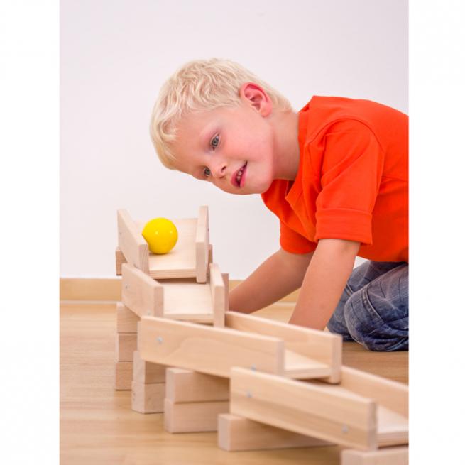 die Kugelbahn besteht aus stabilem Massiv-Holz und ist Made in Germany und zertifiziert. Das spart aufgrund der kurzen Transportwege entsprechend CO2 ein.