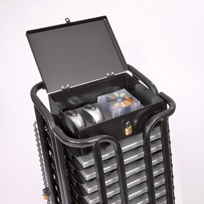 Schützen Sie Ihre wertvollen Laptops und Netzgeräte mithilfe von 3 Vorhängeschlössern (nicht enthalten) über die vorgesehenen Sicherungsvorrichtungen vor unbefugtem Zugriff. Oben befindet sich dabei eine Box, in der Sie Computer-Zubehör, wie z. B. Computer-Mäuse oder CDs, aufbewahren und sicher verschließen.