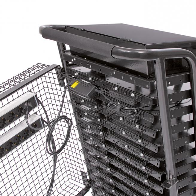 An der Rückseite des Trolleys befestigen Sie zwei Mehrfachsteckdosen (nicht enthalten). Dort bleiben die Netzgeräte bei Bedarf immer eingesteckt und die Aufladung der Laptops beginnt automatisch.