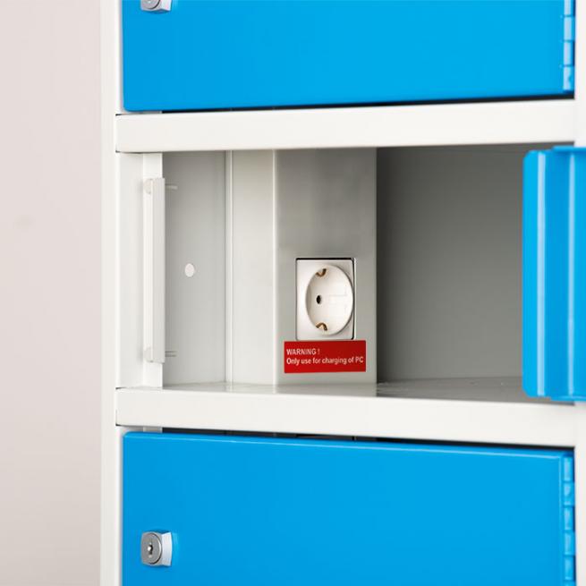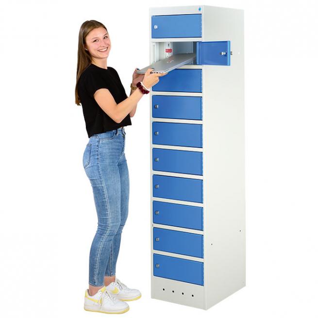 Sicher verwahrt sind Laptops in dem Stahlschrank mit 10 Fächern und abschließbaren Türen. Jede Tür ist mit einem Zylinderschloss ausgestattet, zu dem 2 Schlüssel gehören. Auch eine Hauptschließung ohne Sicherungsschein ist auf Wunsch möglich. Das verschweißte Schrankgehäuse ist sehr stabil und mit einer Zargenumfassung gegen Aufbruch ausgerüstet. Der gelochte Boden und die gelochte Rückwand sowie die Wand-Abstandshalter sorgen für gute Belüftung. Wahlweise mit oder ohne Stromversorgung erhältlich.