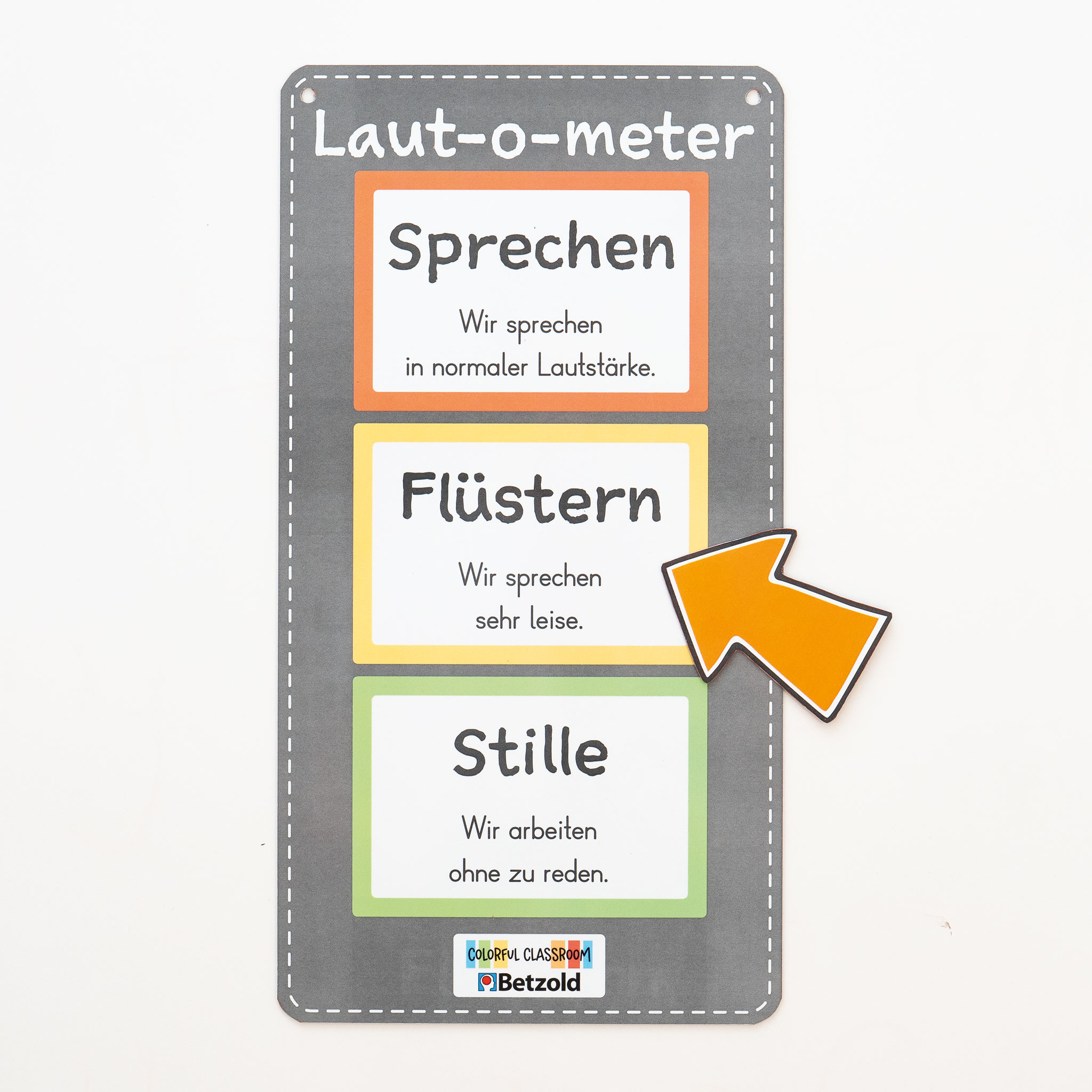 Regulieren Sie einfach und effizient den Lautstärkepegel im Klassenzimmer. Der Lärmpegel im Unterricht variiert häufig. Mithilfe des Laut-o-meters visualisieren Sie diese Lautstärke. Über den leicht beweglichen und magnetischen Pfeil passen Sie es einfach und schnell an die unterschiedlichen Arbeitsphasen Ihres Unterrichts an. Dank englischsprachig bedruckter Rückseite nutzen Sie das Laut-o-meter auch im Fach Englisch.