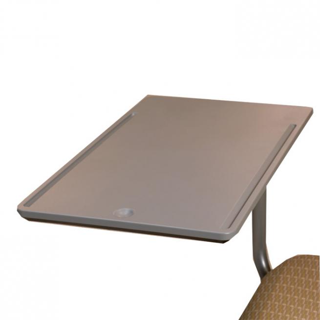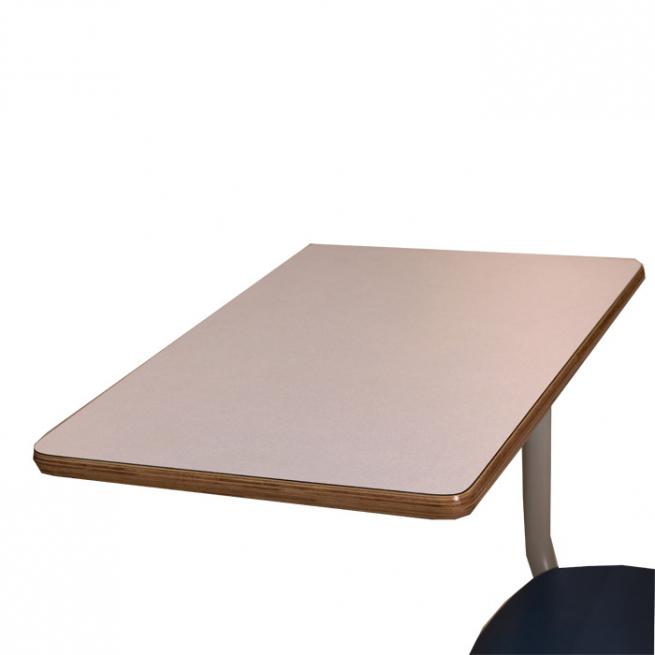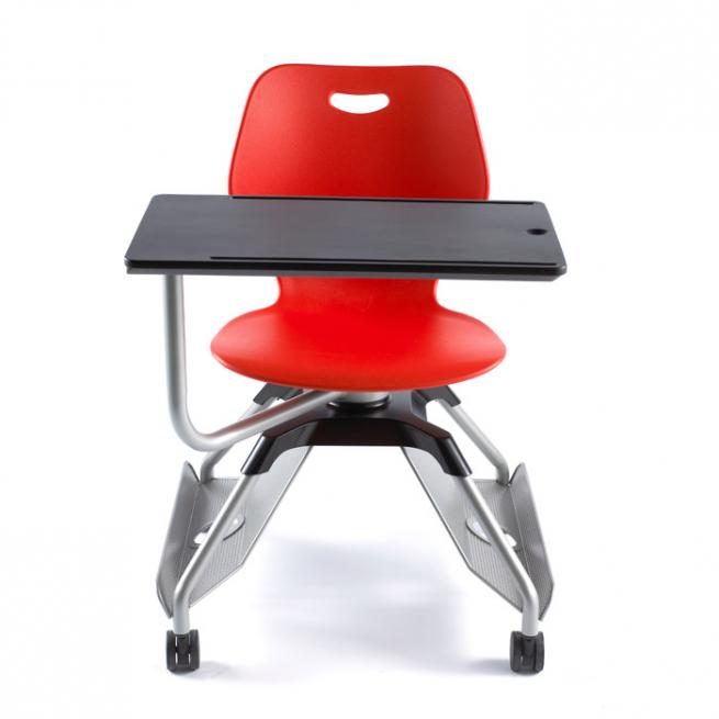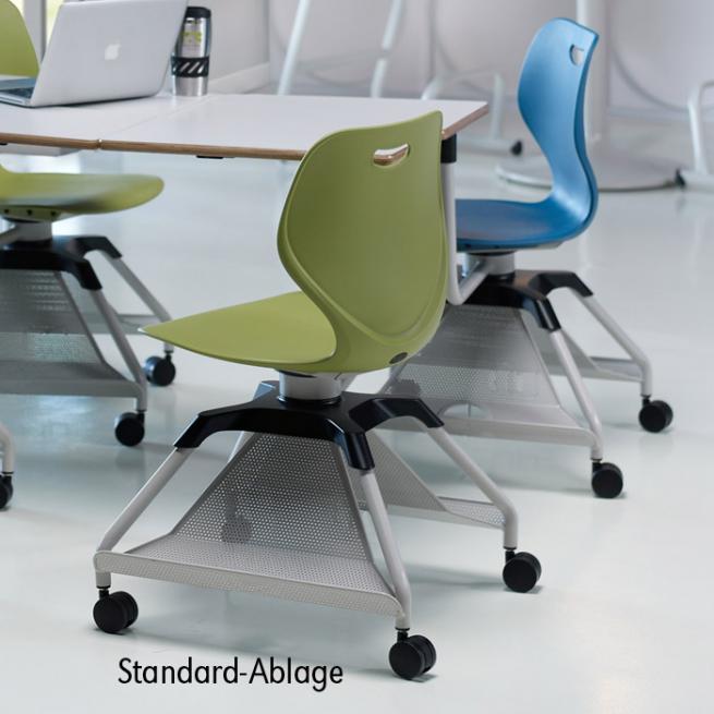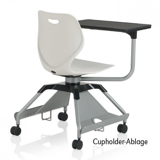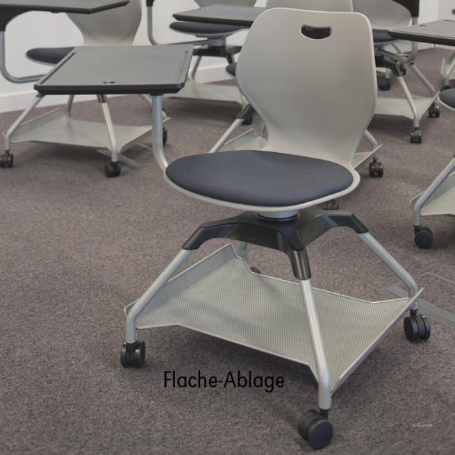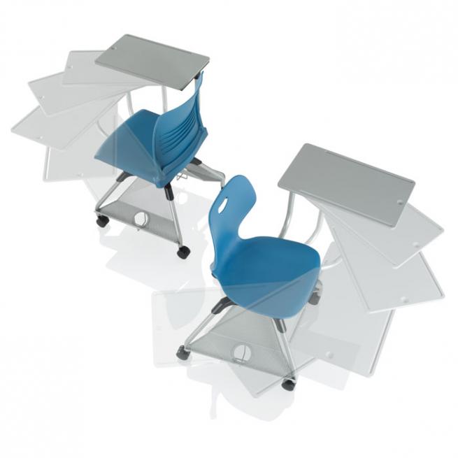 Flexibler Einzelarbeitsplatz und schnell umgestellt für Gruppenarbeiten. Höhenverstellbare, sehr große Arbeitsfläche. Diese ist um 154° drehbar, 30° schwenkbar, der Trägerarm rotiert 220° für die perfekte, ergonomische Position des Tablets aus Polypropylen oder laminiert aus HPL. Am Stuhl können verschiedene, gelochte Stahl-Ablagen angebracht werden – für Taschen, Bücher oder sogar Getränke. Rollen bremsen unter Last, sodass der Stuhl nicht wegrollt.