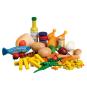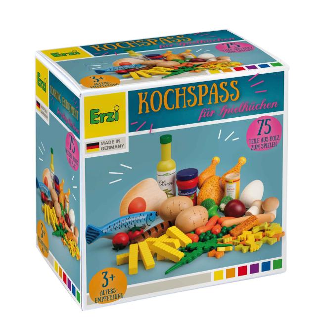 75 Lebensmittel-Einzelteile, gefertigt aus Buchenholz, farbig lackiert. Ob Würstchen, Pommes, Gemüse, Fisch oder Grillhähnchen – kleine Küchenfans zaubern aus diesen Zutaten 2 bis 3 Gerichte. Gleichzeitig überlegen sie sich, wie sie die unterschiedlichen Lebensmittel zusammenstellen und beschäftigen sich mit verschiedenen Lebensmitteln. Dabei ergeben sich zahlreiche Gesprächsanlässe und viele Gelegenheiten zu sozialer Interaktion.