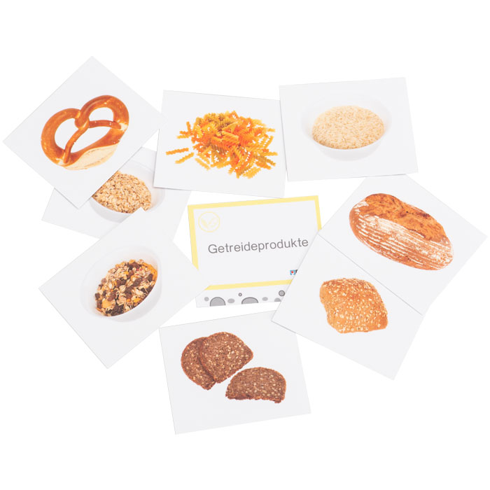 105 Karten (16 Aufgabenkarten: 8 Deutsch/Symbol und 8 Englisch/Französisch sowie 89 Fotokarten Lebensmittel)