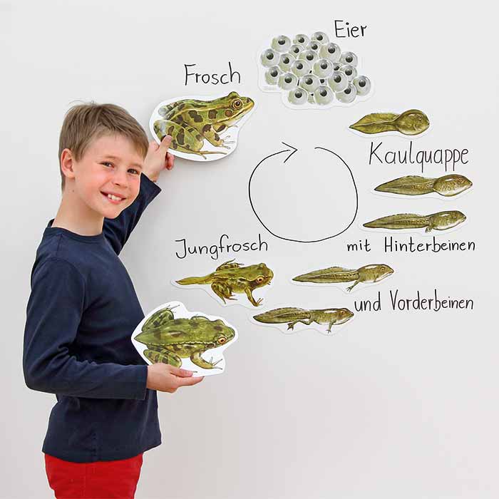 Zeigen Sie die Entwicklungsstadien des Frosches Schritt für Schritt für alle gut sichtbar an der Tafel. Die naturgetreuen Bilder sind extragroß und haften magnetisch auf jeder Stahltafel.