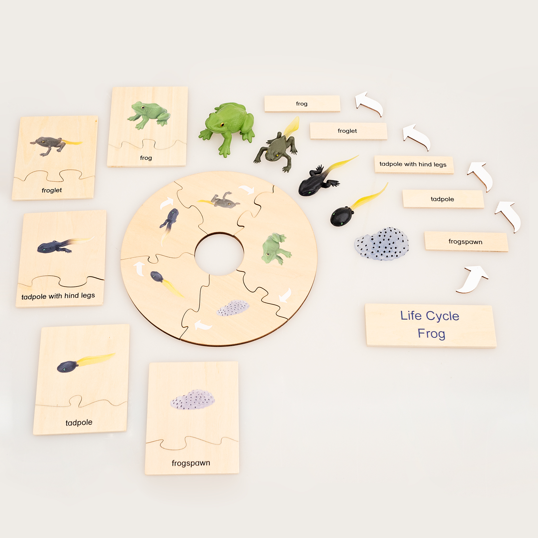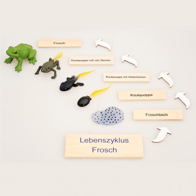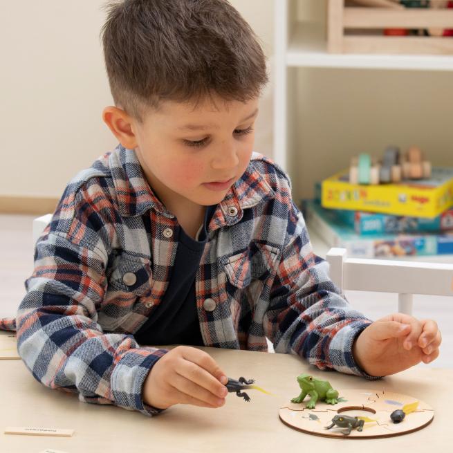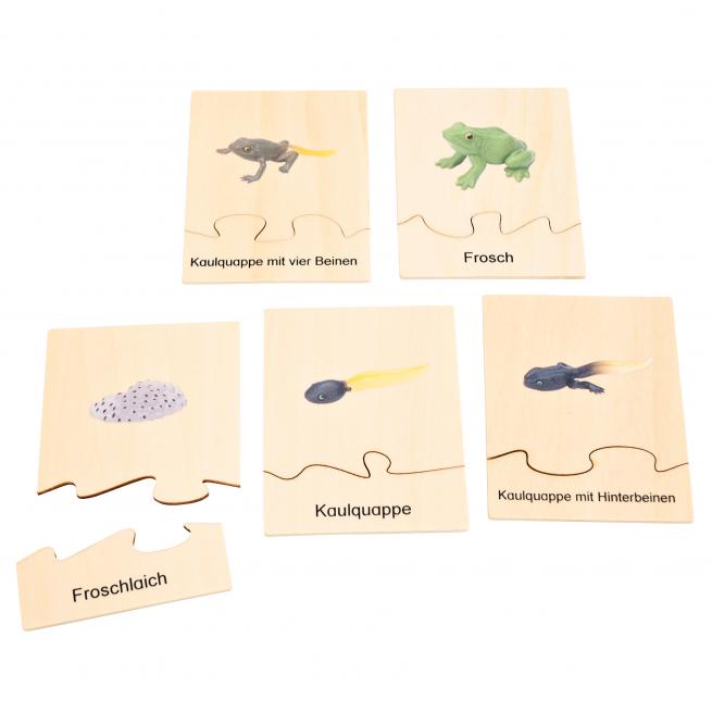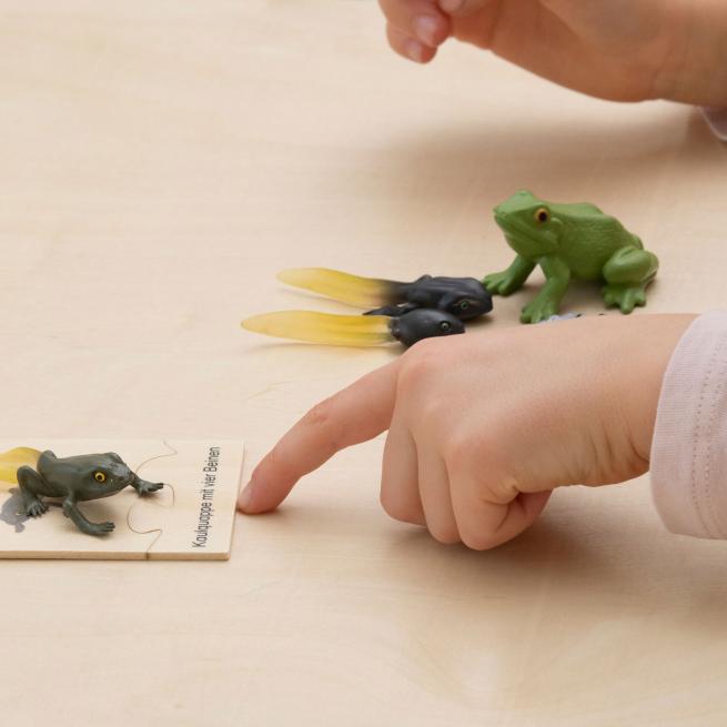 Wie sich aus Froschlaich ein Frosch entwickelt, entdecken Sie mit Ihren Kindern anschaulich mithilfe des mehrteiligen Lebenszyklus-Lernspiels. Die 5 enthaltenen Modelle sind gut greifbar und hygienisch abwaschbar. So erforschen die Kinder die Stadien Froschlaich, Kaulquappe, Kaulquappe mit Hinterbeinen, Kaulquappe mit vier Beinen und schließlich den entwickelten Frosch haptisch. Dazu sind zwei Puzzle aus Holz enthalten. Die unterschiedlichen Entwicklungsstadien prägen sich durch das Zusammensetzen besonders gut ein. Wenn die Puzzleteile zusammenpassen, ist dies gleichzeitig eine gute Selbstkontrolle für die Kinder.
