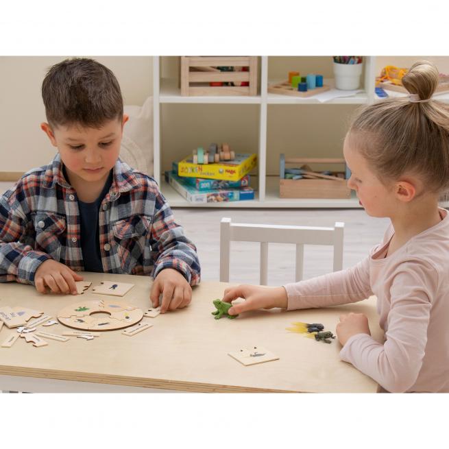 Die Beschreibungsholzplättchen zu den einzelnen Modellen und die rechteckigen Puzzleteile zeigen die einzelnen Phasen als Illustration und die deutsche sowie englische Bezeichnung. Neben ihrem bilingualen Wortschatz trainieren die Kinder auch spielend ihre Auge-Hand-Koordination, die Feinmotorik und Konzentration. Bestens geeignet für Thementage (auch im Kindergarten), den MINT- bzw. Sachunterricht oder Lernstationen. Inklusive praktischer Aufbewahrungsbox aus Holz.
