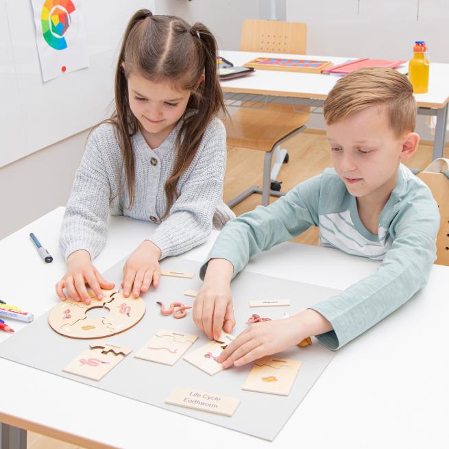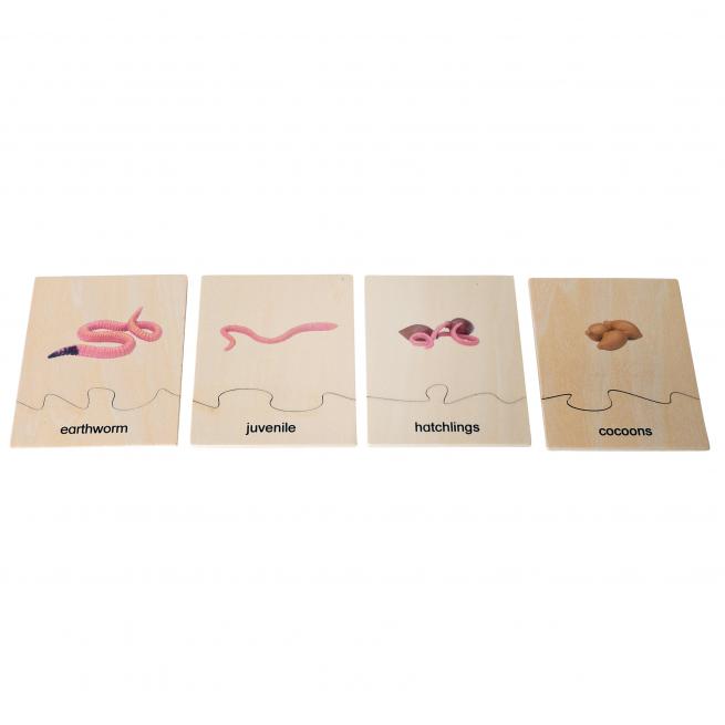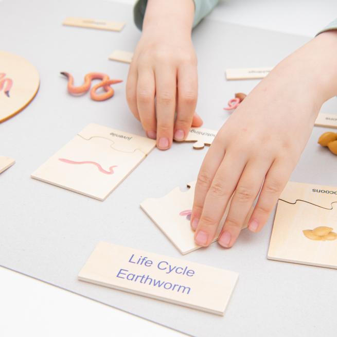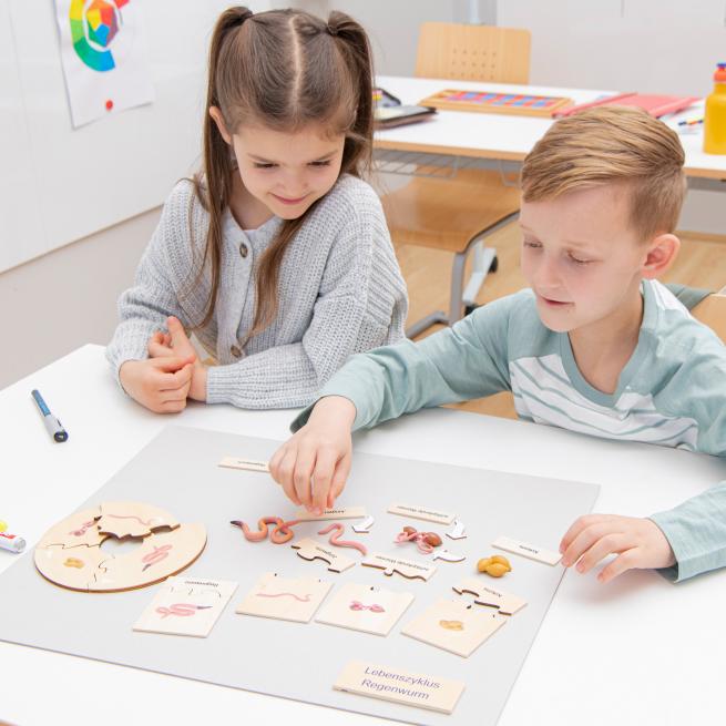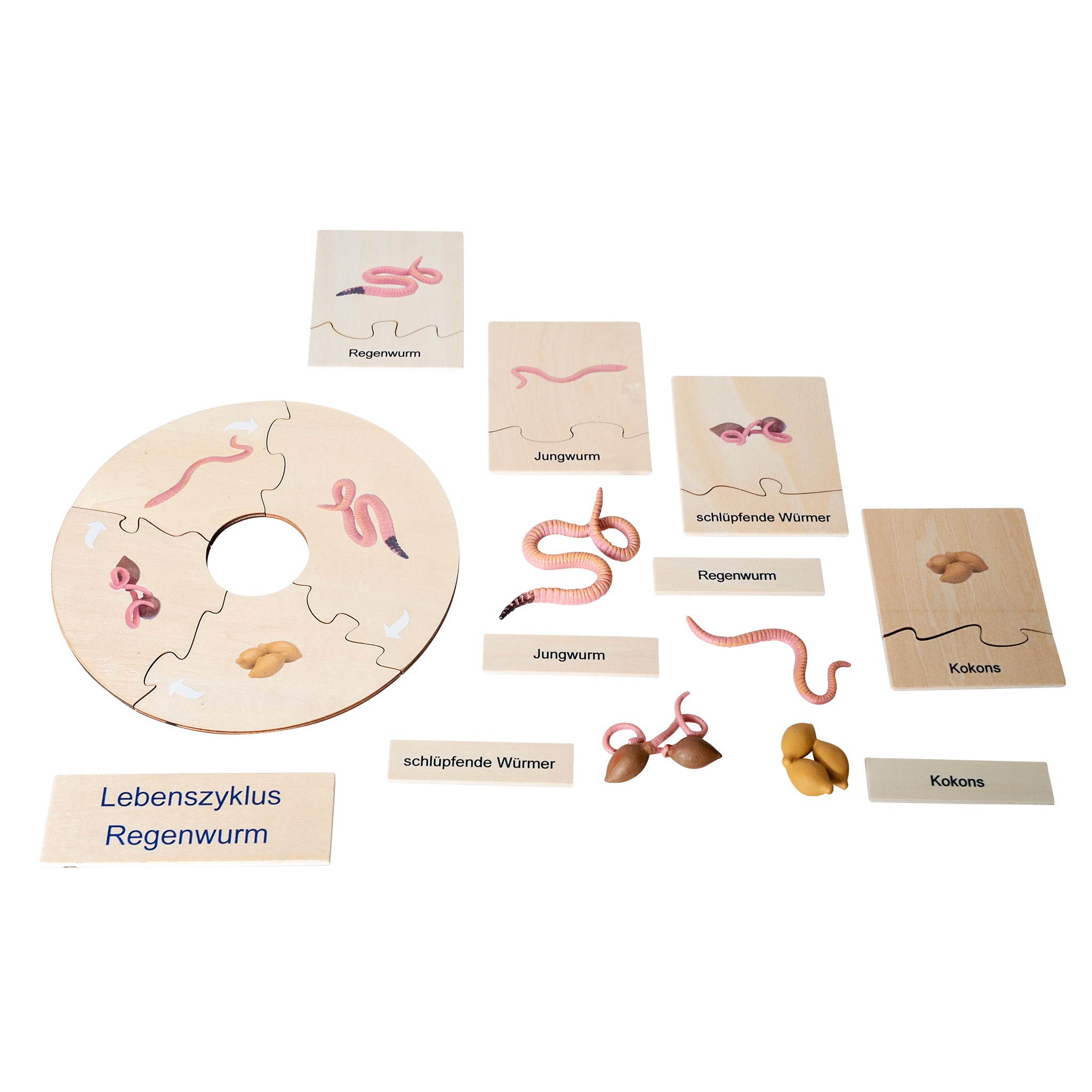 Wie sich ein Regenwurm entwickelt, entdecken Sie mit Ihren Kindern anschaulich mithilfe des mehrteiligen Lebenszyklus-Lernspiels. Die 4 enthaltenen Modelle sind gut greifbar und hygienisch abwaschbar. So erforschen die Kinder die Stadien Kokons, schlüpfende Würmer, Jungwurm und schließlich den entwickelten Regenwurm haptisch. Dazu sind zwei Puzzle aus Holz enthalten. Die unterschiedlichen Entwicklungsstadien prägen sich durch das Zusammensetzen besonders gut ein. Wenn die Puzzleteile zusammenpassen, ist dies gleichzeitig eine gute Selbstkontrolle für die Kinder.