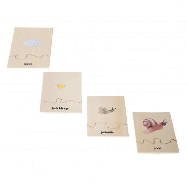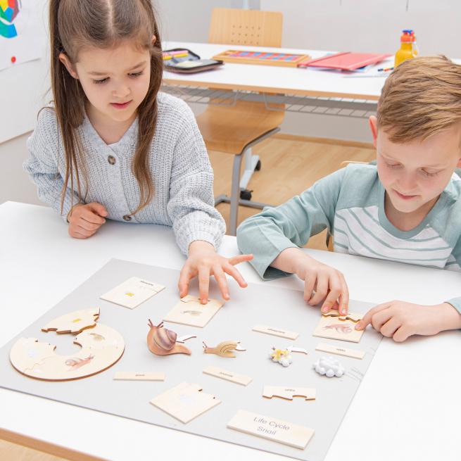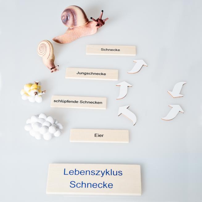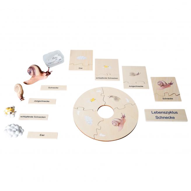 Den Lebenszyklus der Schnecke entdecken Sie mit Ihren Kindern anschaulich mithilfe des mehrteiligen Lernspiels. Die 4 enthaltenen Modelle sind gut greifbar und hygienisch abwaschbar. So erforschen die Kinder die Stadien Eier, schlüpfende Schnecken, Jungschnecke und schließlich die entwickelte Schnecke haptisch. Dazu sind zwei Puzzle aus Holz enthalten. Die unterschiedlichen Entwicklungsstadien prägen sich durch das Zusammensetzen besonders gut ein. Wenn die Puzzleteile zusammenpassen, ist dies gleichzeitig eine gute Selbstkontrolle für die Kinder.