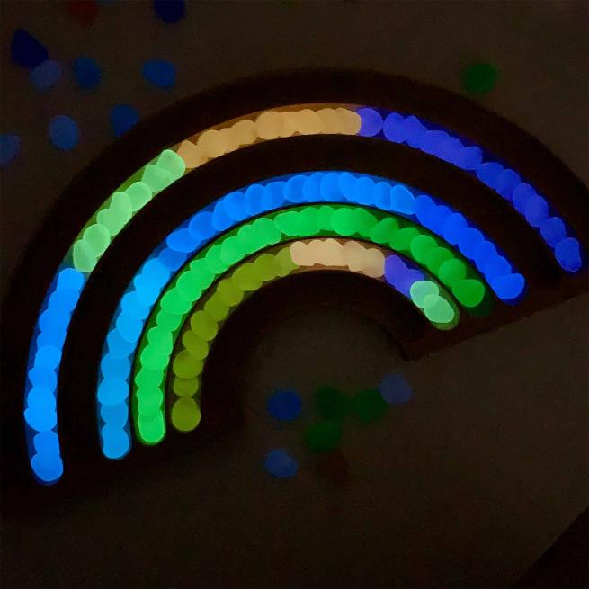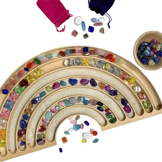 Durch Sortierspiele machen sich Kinder z. B. mit unterschiedlichen Farben oder auch Mengen vertraut. Wer das Regenbogen-Legebrett gern als Grundlage für an die Jahreszeiten angepassten Dekorationen nutzen möchte, sammelt mit den Kindern z. B. Naturmaterialien wie Blätter, Tannzapfen, saisonales Grün, Kieselsteine, Eicheln, Nüsse, Sand, etc.