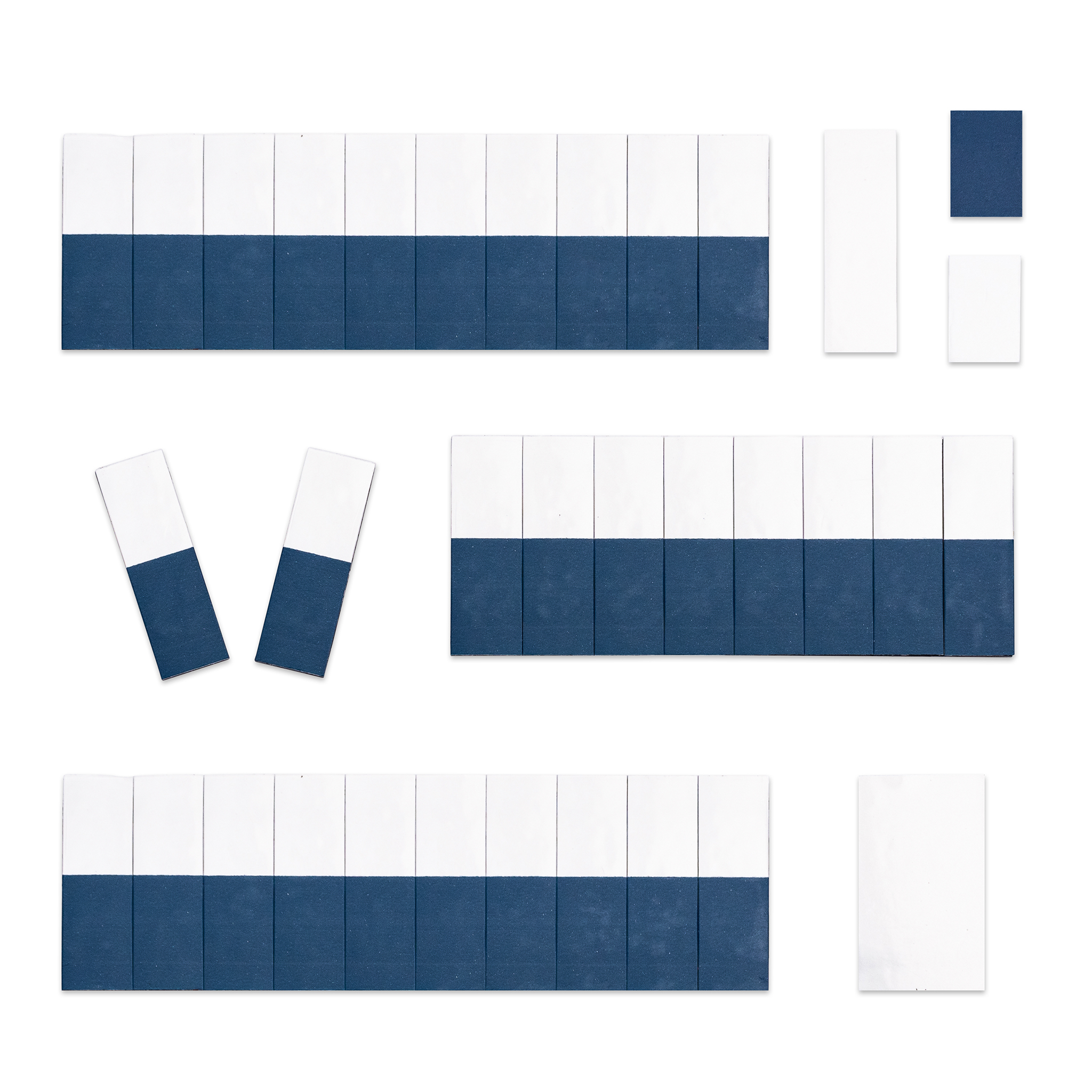 30 Kippmagnete, 10 x 30 mm, halb farbig, halb weiß.