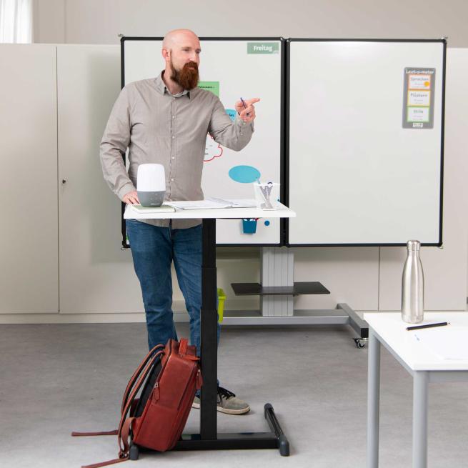 Der höhenverstellbare Lehrer- und Bürotisch mit Gasdruckfeder passt sich im Handumdrehen Ihrer Arbeitssituation an. So starten Sie ergonomisch, flexibel und immer auf Augenhöhe in Ihren Schul- oder Büroalltag. Ob im Stehen vor der Klasse oder im Sitzen beim Korrigieren – Sie verstellen den Tisch stufenlos von 65,5 cm bis auf 102,5 cm Höhe. Das sorgt für mehr Beweglichkeit im Alltag und unterstützt eine rückenschonende Haltung. Wählen Sie zwischen robusten Kunststoff- oder bodenschonenden Filzgleitern – je nachdem, wie der Fußboden in Ihrem Raum beschaffen ist. Erhältlich in 6 Dekoren. Fertig montiert.