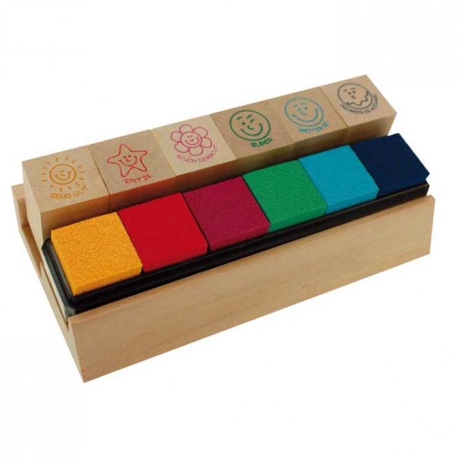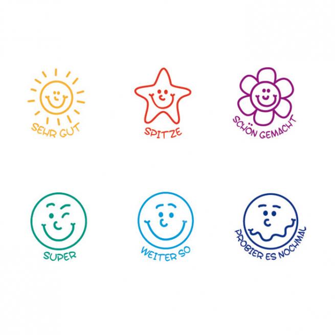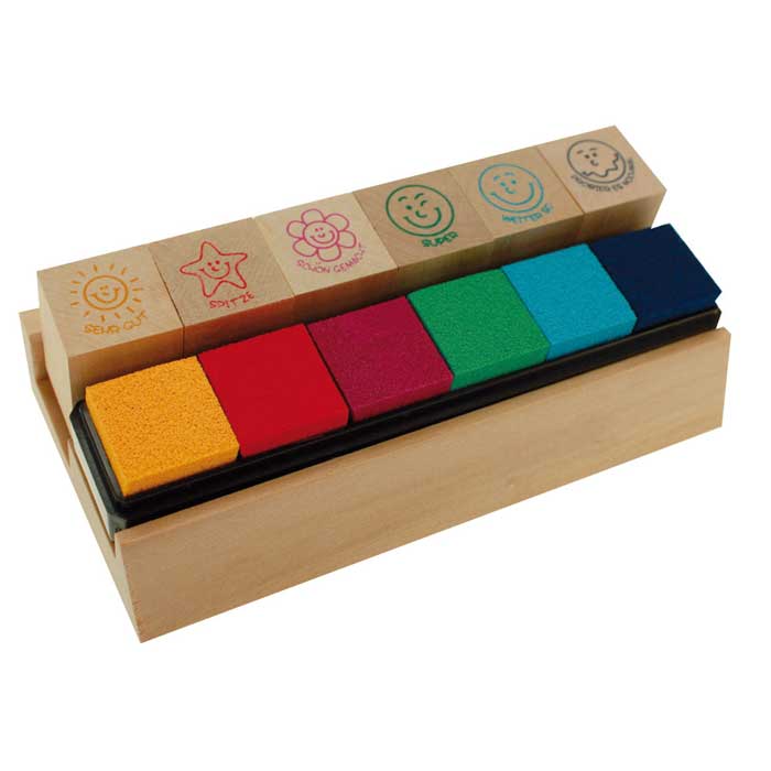 6 kindgerechte Motive mit 6 kleinen farbigen Stempelkissen. Alles griffbereit im praktischen Holzständer. Perfekt zur Motivation Ihrer Schüler – für Ihr Lehrerpult in der Schule und für den Schreibtisch zu Hause.