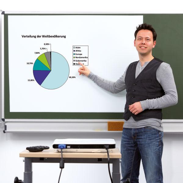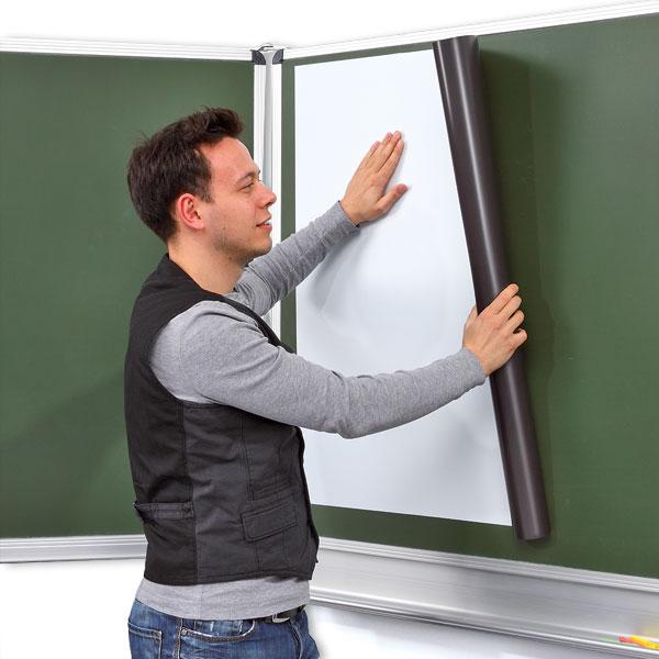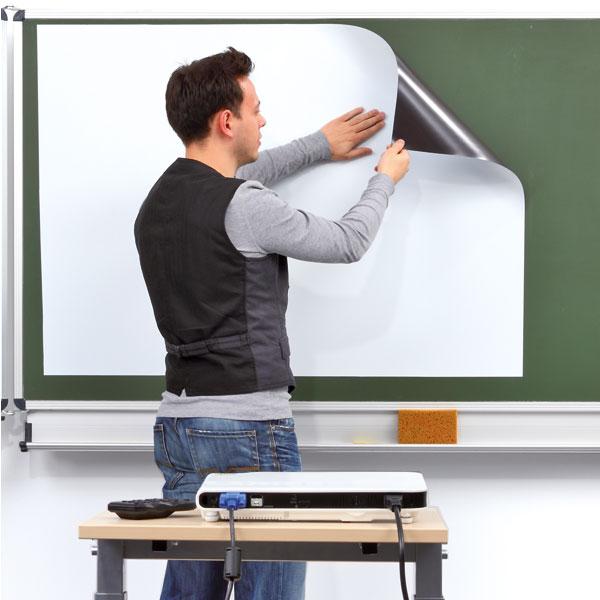 Die magnetische Leinwand-Folie wird einfach an der Tafel ausgerollt und absolut glatt und faltenfrei positioniert. Die mattweiße Oberfläche reflektiert optimal das Licht und lässt deutliche, intensive Farben entstehen.