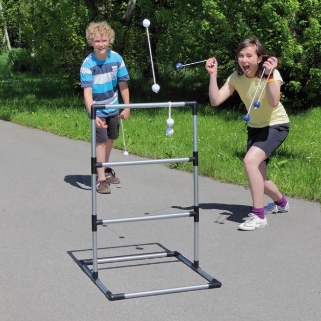 Für das Spiel Leitergolf werden spezielle Bälle „Bolas" benötigt. Bolas sind 2 Golfbälle, die mit einer Schnur miteinander verbunden sind. Wer hier die Bolas zielgenau auf einer der drei Leiter-Sprossen platziert und dabei die meisten Punkte erzielt, gewinnt.