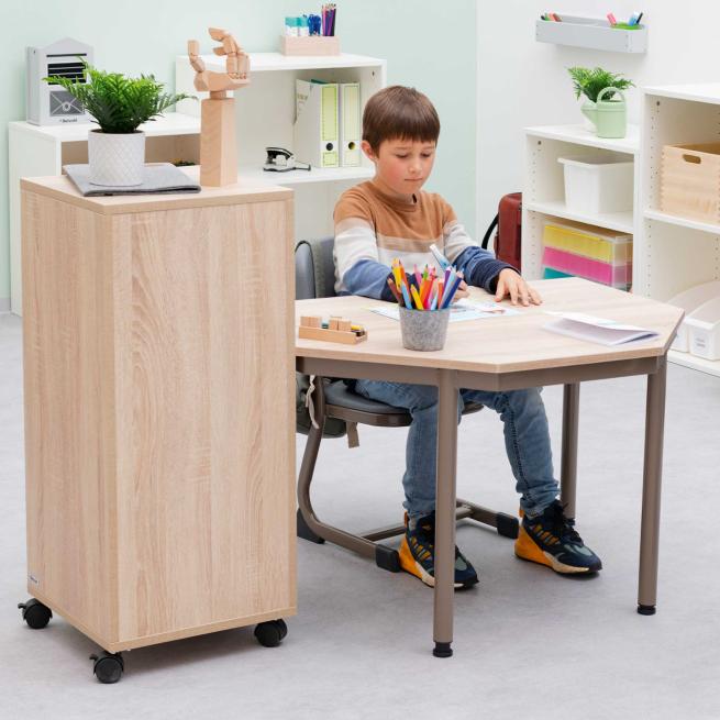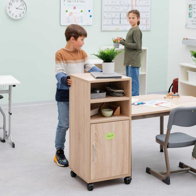 Der LernFlex 2 Caddy ist Teil der Möbelserie LernFlex 2 und lässt sich optimal kombinieren mit dem passenden Sechsecktisch. Ihren neuen kompakten Caddy mit 41 cm Tiefe und Sichtrückwand stellen Sie aus zwei unterschiedlichen Höhen und sechs Dekoren individuell zusammen. Der Korpuss des Caddys besteht aus Holz und ist mit feststellbaren Rollen zum leichten Verschieben ausgestattet. In den beiden offenen Regalfächern und dem Fach mit Tür verstauen Sie und Ihre Schülerinnen und Schüler Materialien griffbereit für den Unterricht in Grund- und weiterführender Schule. Die Lieferung erfolgt fertig montiert.