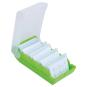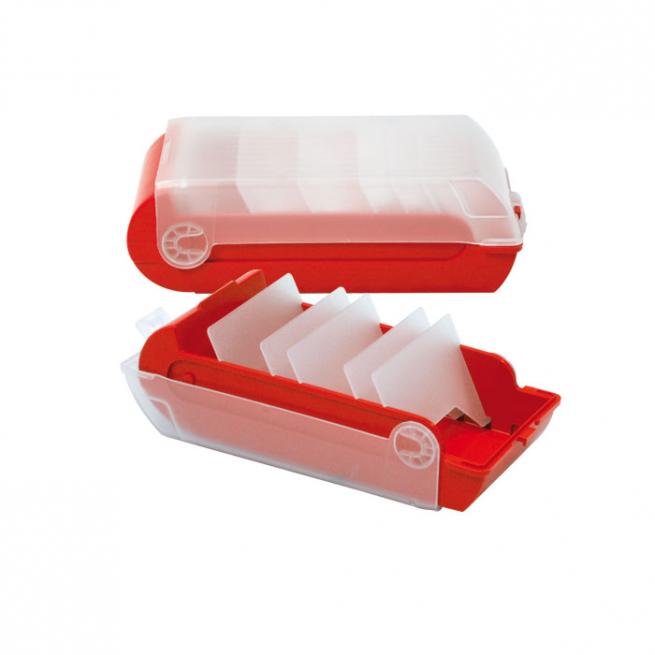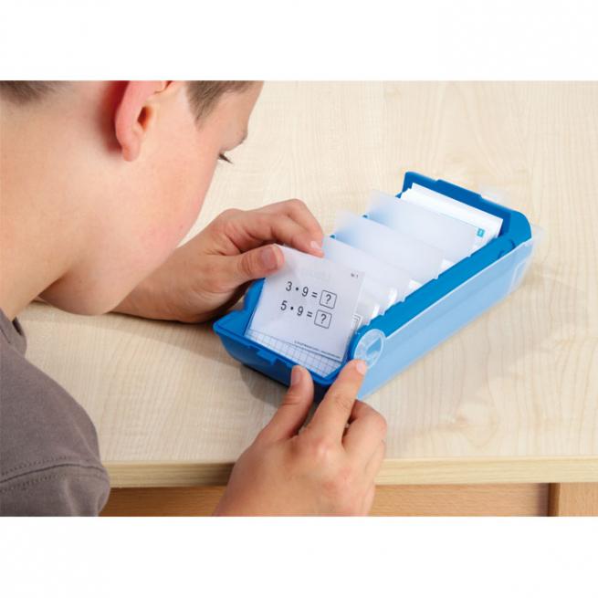 Den Deckel schieben die Schüler, ohne dass er abgenommen wird, unter den Kasten. Er kann leicht gedreht werden. Der Karteikasten nimmt dann nur wenig Platz auf dem Tisch ein. Die 5 beweglichen Fachteiler lassen sich in unterschiedlichen Abständen einsetzen. Die Kinder können den Lernkarteikasten gut in der Schultasche transportieren. Die Karten kommen auf keinen Fall durcheinander.