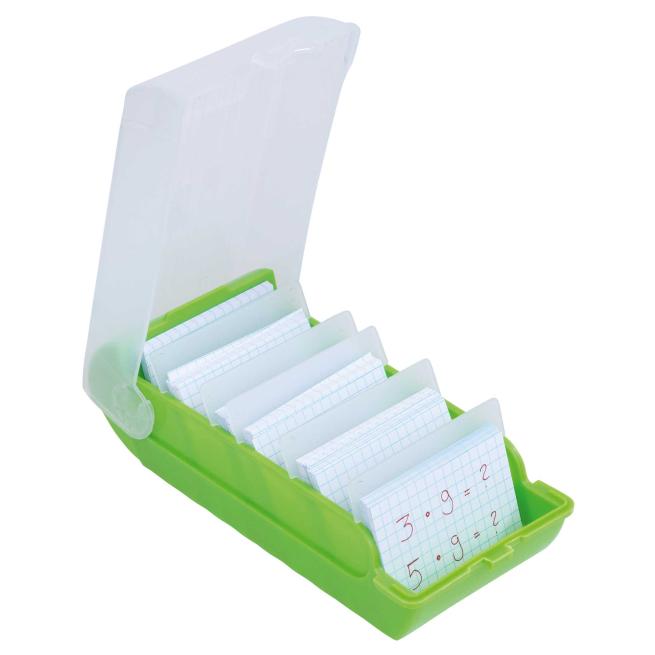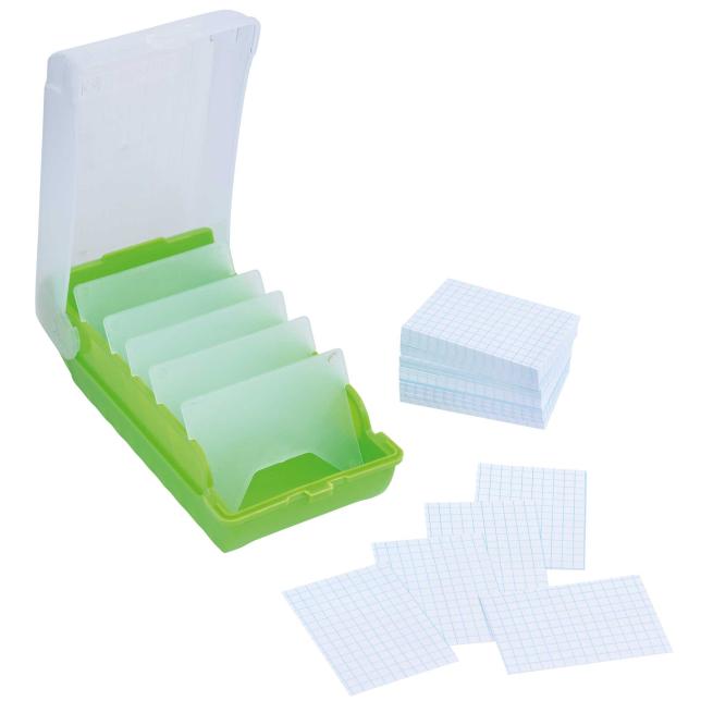 Mit Lernkarteien wird das Grundwissen aus vielen Fachbereichen durch ständiges Abfragen gefestigt. Mit selbst geschriebenen Kärtchen lernen Ihre Schüler häufig am schnellsten. Viele Kinder prägen sich beim Abschreiben vieles ein. Der Lernkarteikasten aus transparentem Kunststoff ist äußerst stabil. Er bringen bis zu 500 Karten DIN A8 unter.