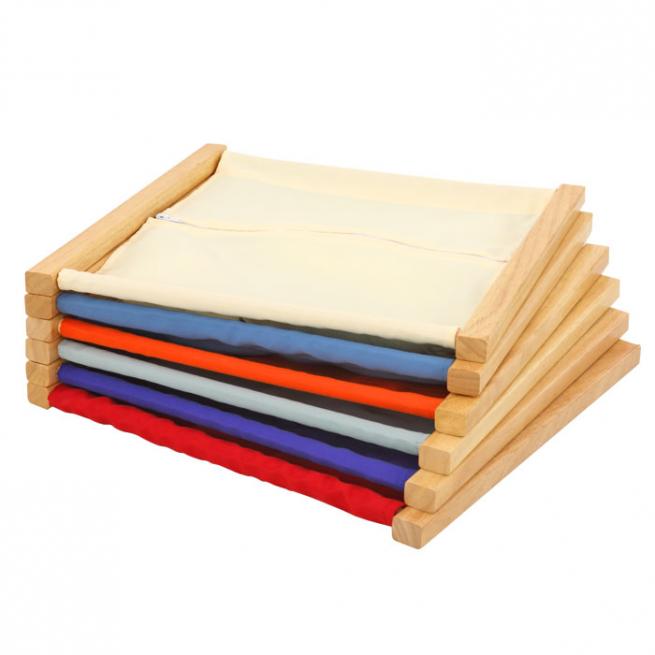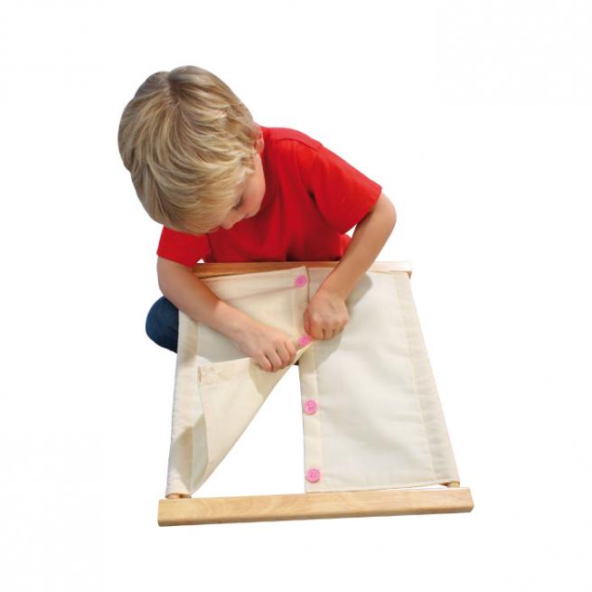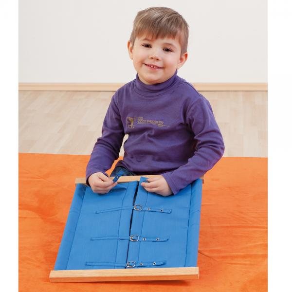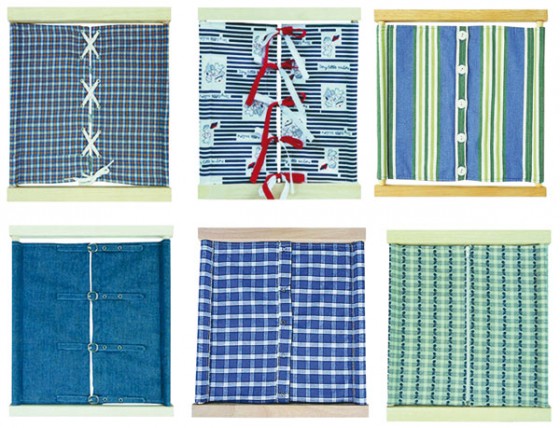 Mit diesen Montessori-Rahmen lernen Kinder die verschiedenen Verschlüsse kennen und damit umzugehen.