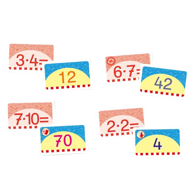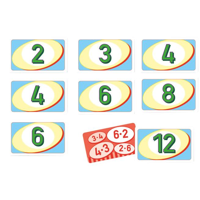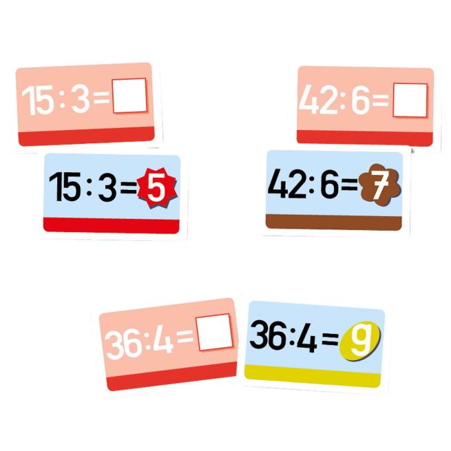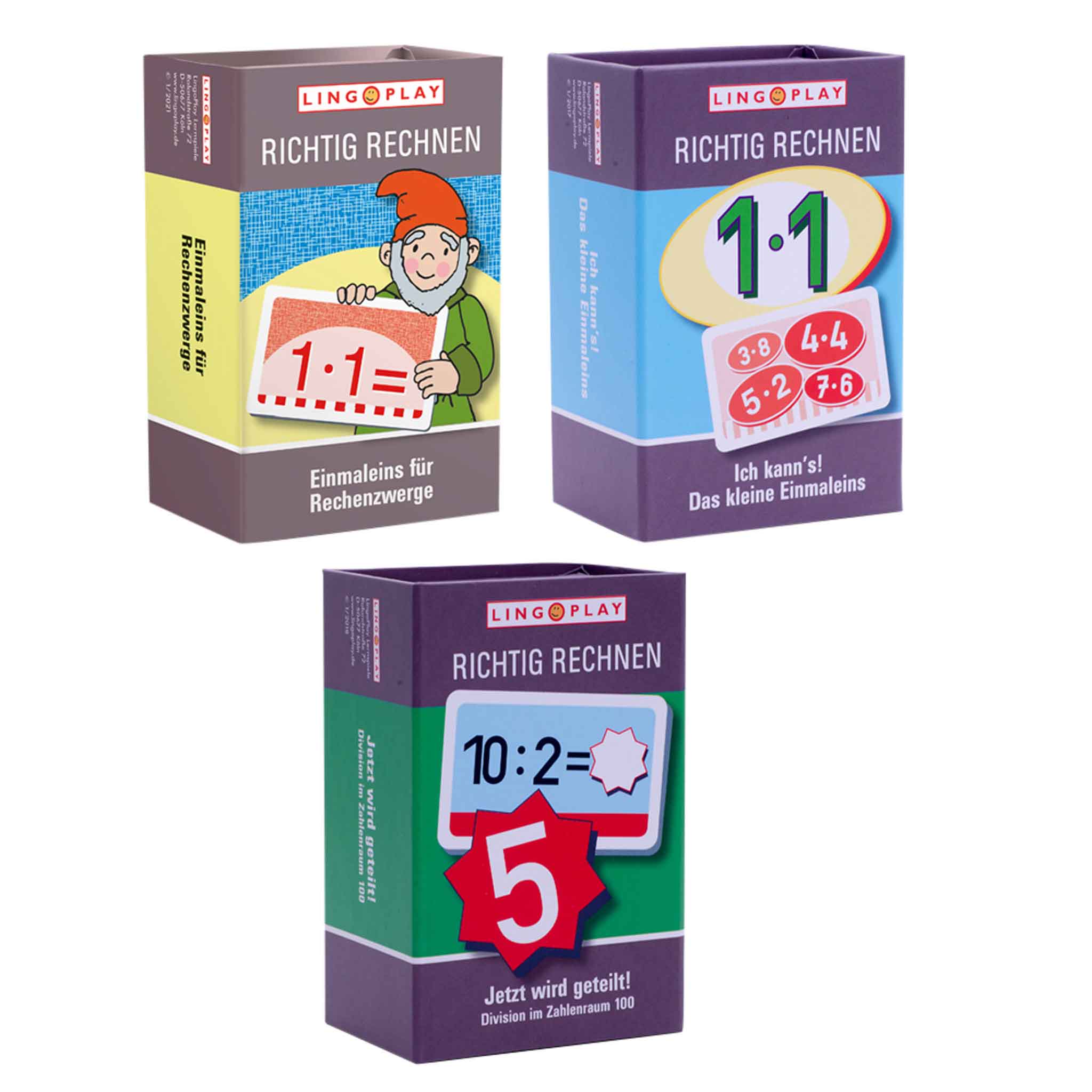 Set aus 3 Kartenspielen für je 2 – 4 Spieler. Zum unterhaltsamen Einüben und Festigen der Grundrechenarten Division und Multiplikation. Die Vorderseiten der Spielkarten zeigen jeweils Rechenaufgaben, die die Kinder fleißig im Kopf lösen, auf den Kartenrückseiten befinden sich die Ergebnisse zur Selbstkontrolle. Die Spiele haben einen je eigenen Schwierigkeitsgrad, sind jeweils für eine bestimmte Altersgruppe konzipiert und zum Teil auch für Kinder mit Dyskalkulie geeignet.