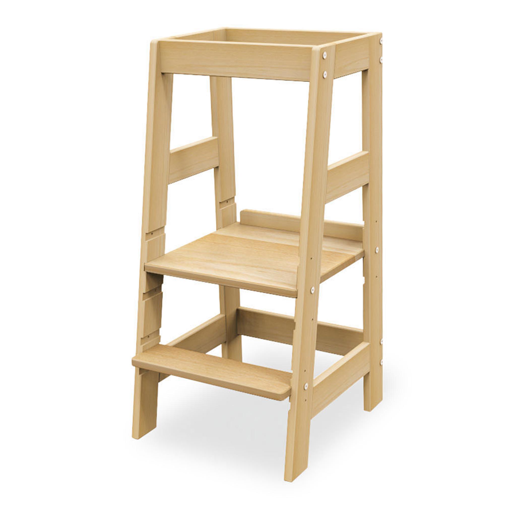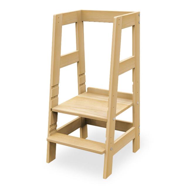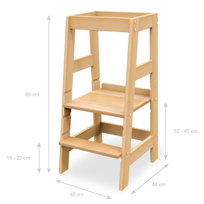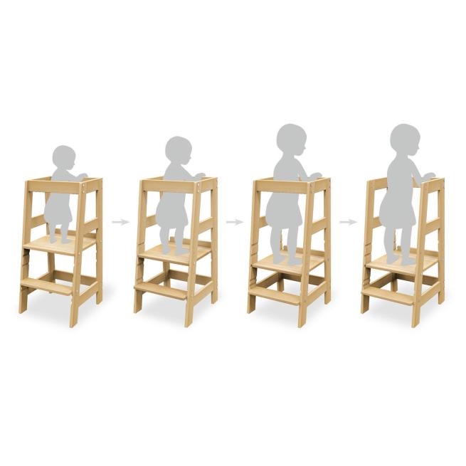 Mithilfe des Lernturms Fino sind Kinder ab dem Stehalter immer auf Augenhöhe dabei. Ob z. B. an hohen Tischen, an der Arbeitsplatte in der Küche oder im Gruppenraum, der Lernturm ist einfach vielseitig einsetzbar. Dank der dreifach höhenverstellbaren Trittstufe steigen Kinder selbstständig und sicher den Lernturm hinauf. Zudem ist der Turm durch die dreifache Höhenverstellung individuell an die Größe der Kinder anpassbar. Der umlaufende Rausfallschutz verhindert dabei zuverlässig den Tritt ins Leere oder das Herunterfallen. Wer so stets mitten im Geschehen ist, entwickelt Fertigkeiten wie z. B. Lernen durch Beobachten und Mithelfen spielend weiter. Mit wenigen Handgriffen entfernen Sie später, wenn die Kinder älter werden, den rückseitigen Rausfallschutz und nutzen den Lernturm dann als praktischen Tritthocker mit vorderem und seitlichen Haltegriffen.