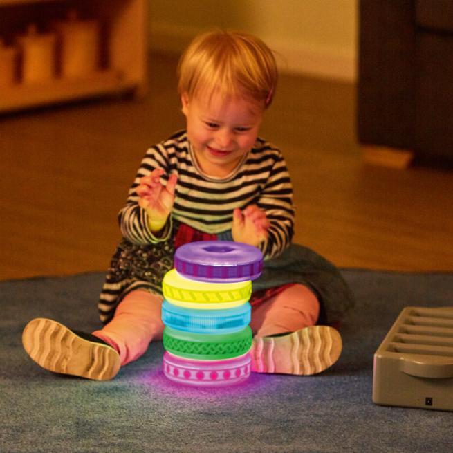 Und wo man schon dabei ist: Das Aufeinanderstapeln funktioniert ebenfalls wunderbar. Lassen Sie Ihre Kleinen fleißig zugreifen, experimentieren und ausprobieren. Im Nu entstehen lustige Türme und andere Bauten. Das macht kreativ und Lust auf mehr: Ältere Kinder erkennen gleich, wie praktisch und reizvoll es ist, die erste selbst gebaute Höhle mit den Leucht-Scheiben zu dekorieren. Und im dunklen Zimmer in die Hand genommen, stellt sich gleich die Frage: Sind die faszinierenden Ringe gar ein weit gereistes Raumschiff aus einer fernen Galaxie? Ein großartiges Spielzeug, das die Fantasie anregt und von dem Sie als Kind garantiert immer geträumt haben!