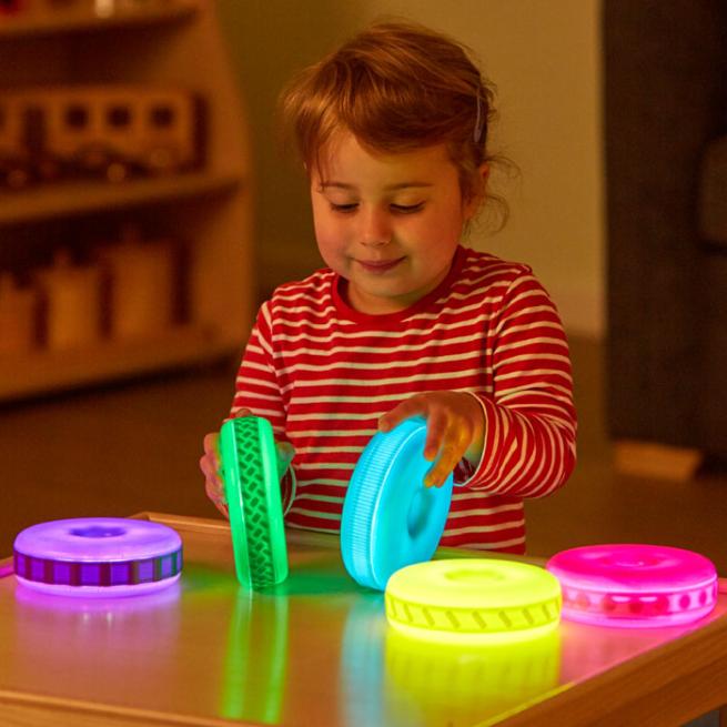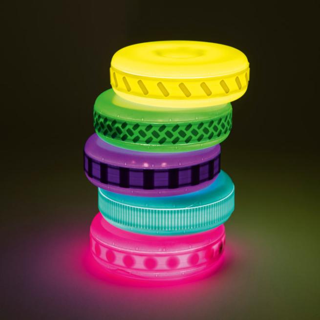 Kaum ausgepackt, sind die Leucht-Scheiben schon der Renner – sobald die Kinder sie in die Hand nehmen und schütteln, erstrahlen sie herrlich bunt in ihrer je eigenen Farbe. Der Lichterglanz hält gut eine Minute und animiert zum sofortigen Weiterschütteln. Dabei merken die Kinder schnell: Die ringförmigen und griffigen Scheiben fühlen sich unterschiedlich an, denn jede besitzt am Rand ihre individuell geprägte Oberfläche. Das macht nicht nur Spaß, sondern schult auf ansprechende Weise Tastsinn und Motorik.